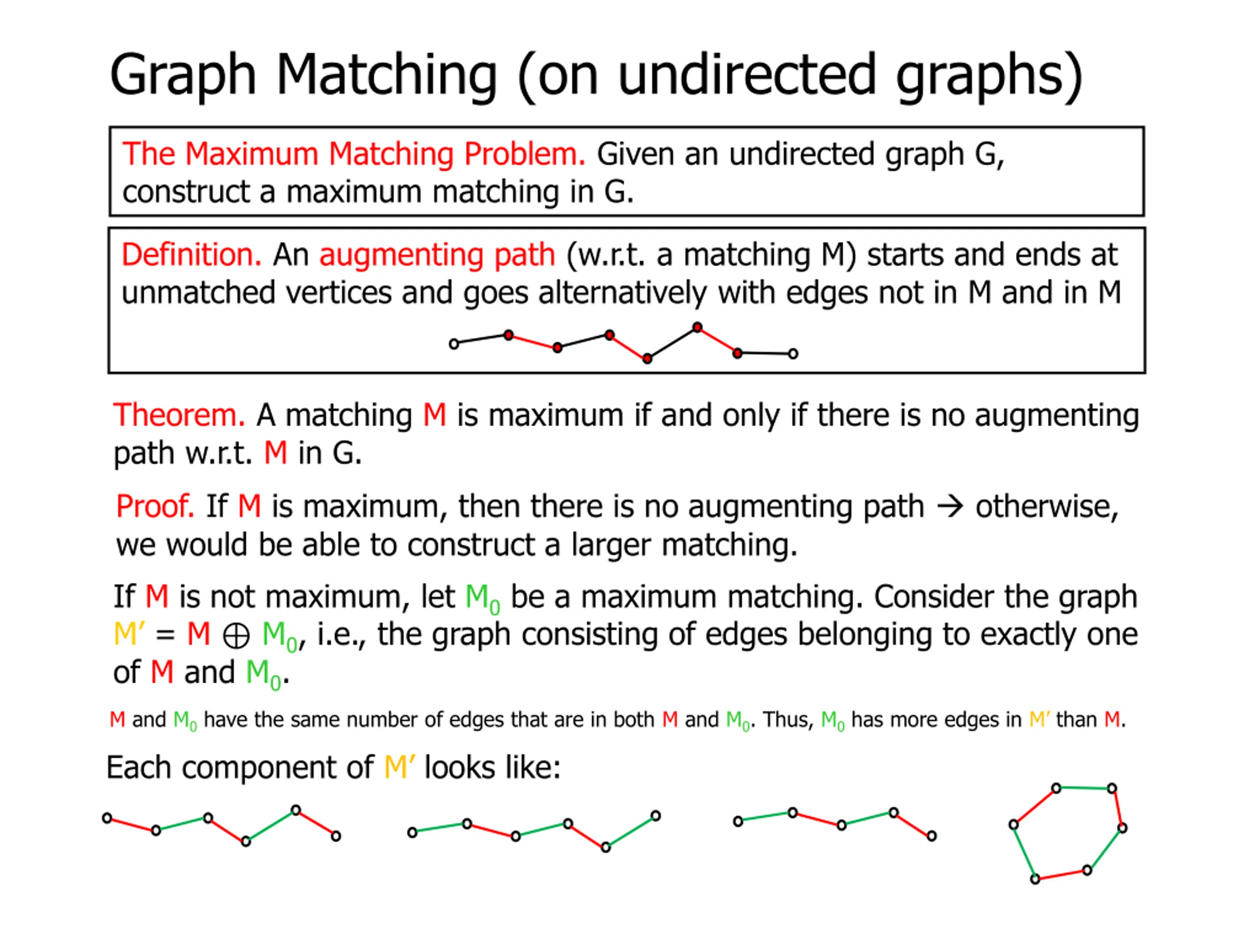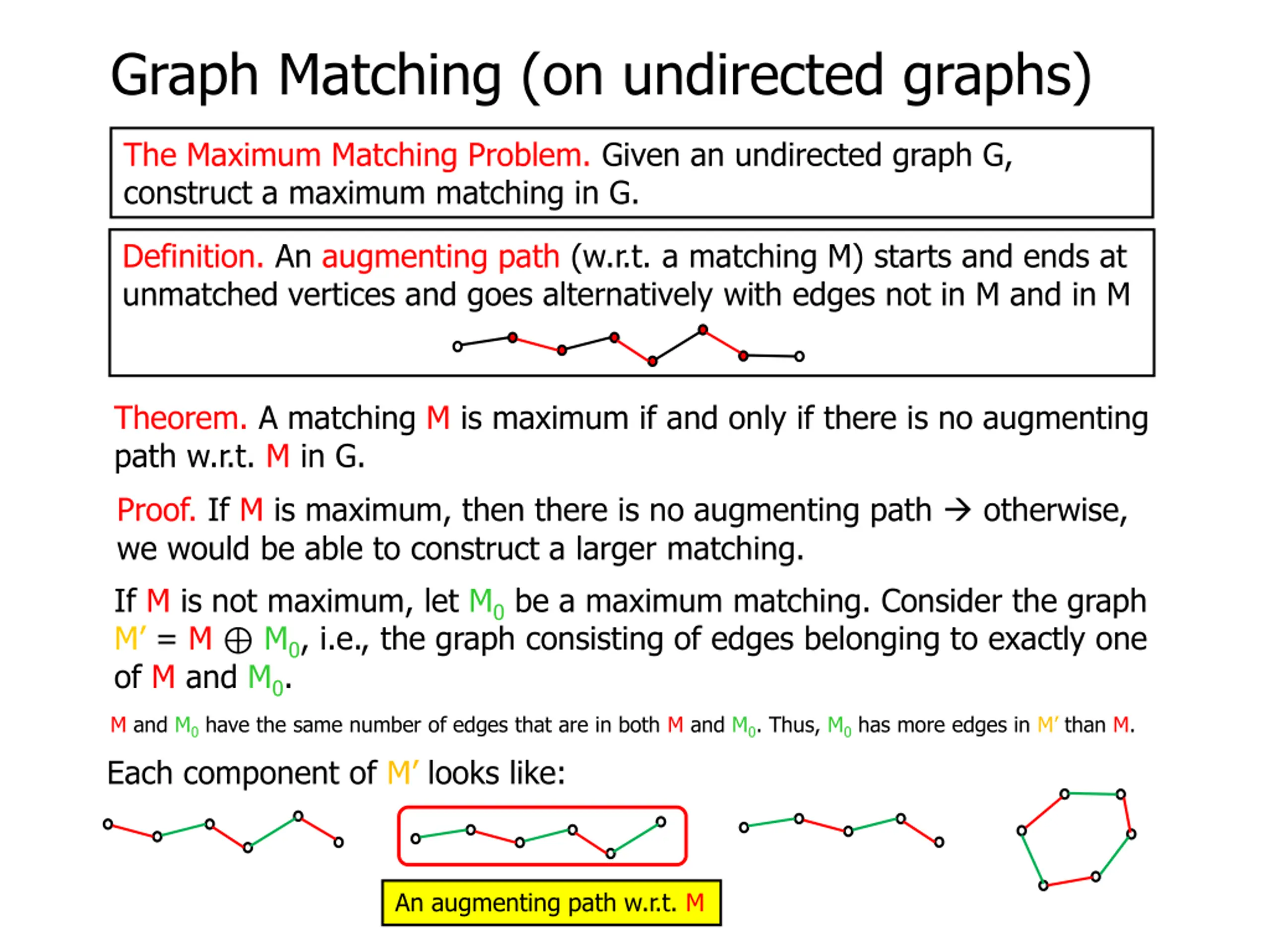 Graph Matching (on undirected graphs) Theorem. A matching M is maximum if and only if there is no augmenting path w.r.t. M in G. An augmenting path P w.r.t. M will give a matching larger than M G