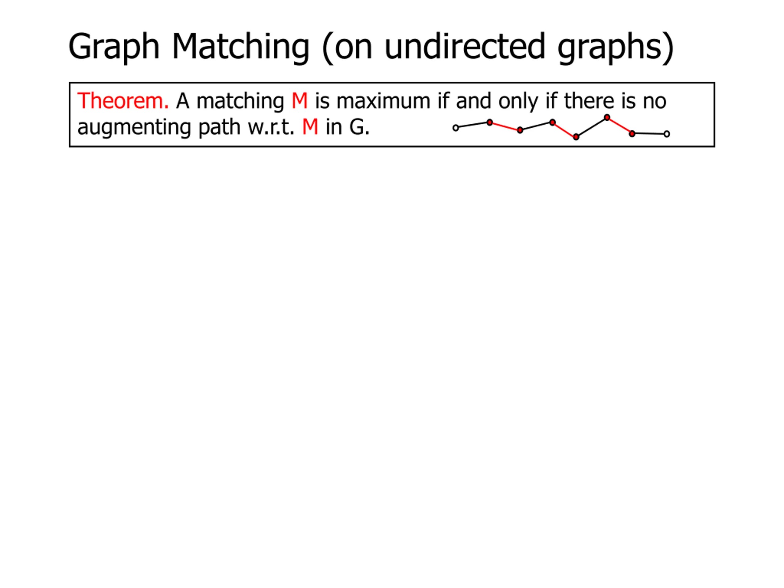 Graph Matching (on undirected graphs) Theorem. A matching M is maximum if and only if there is no augmenting path w.r.t. M in G. An augmenting path P w.r.t. M will give a matching larger than M