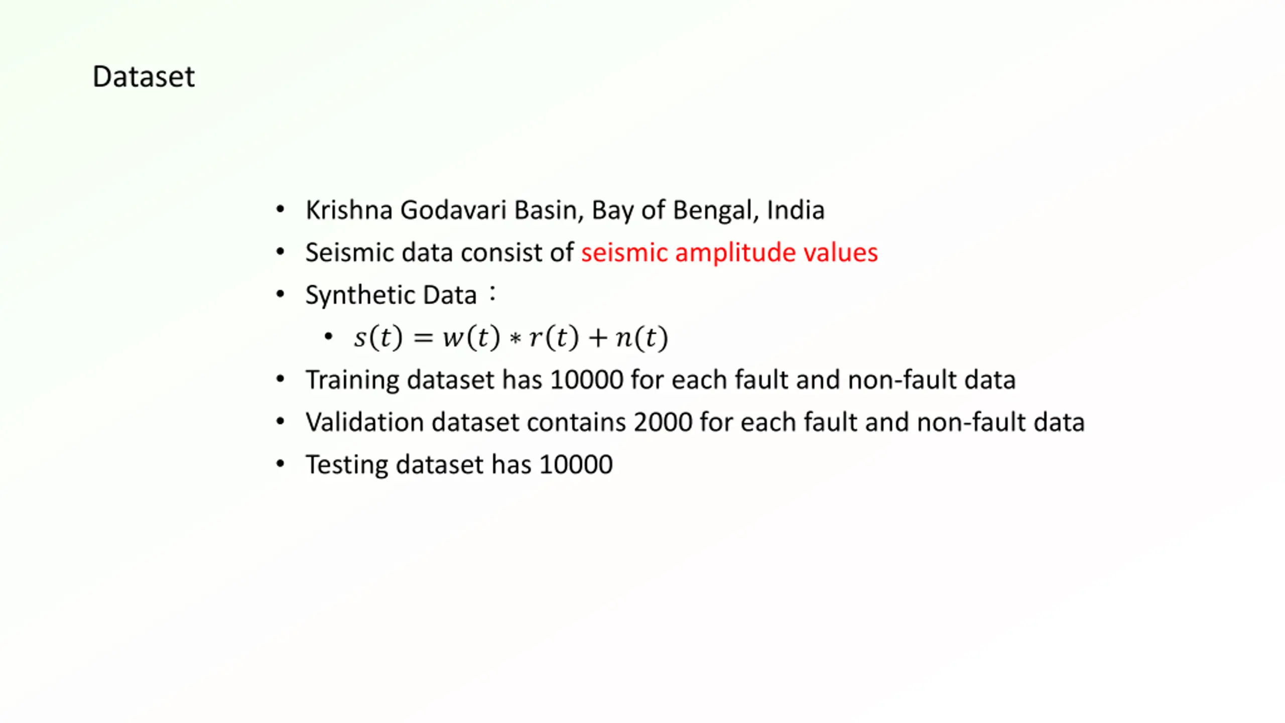 Dataset Krishna Godavari Basin, Bay of Bengal, India Seismic data consist of seismic amplitude values Synthetic Data ? ? = ? ? ? ? + ?(?) Training dataset has 10000 for each fault and non-fault data Validation dataset contains 2000 for each fault and non-fault data Testing dataset has 10000