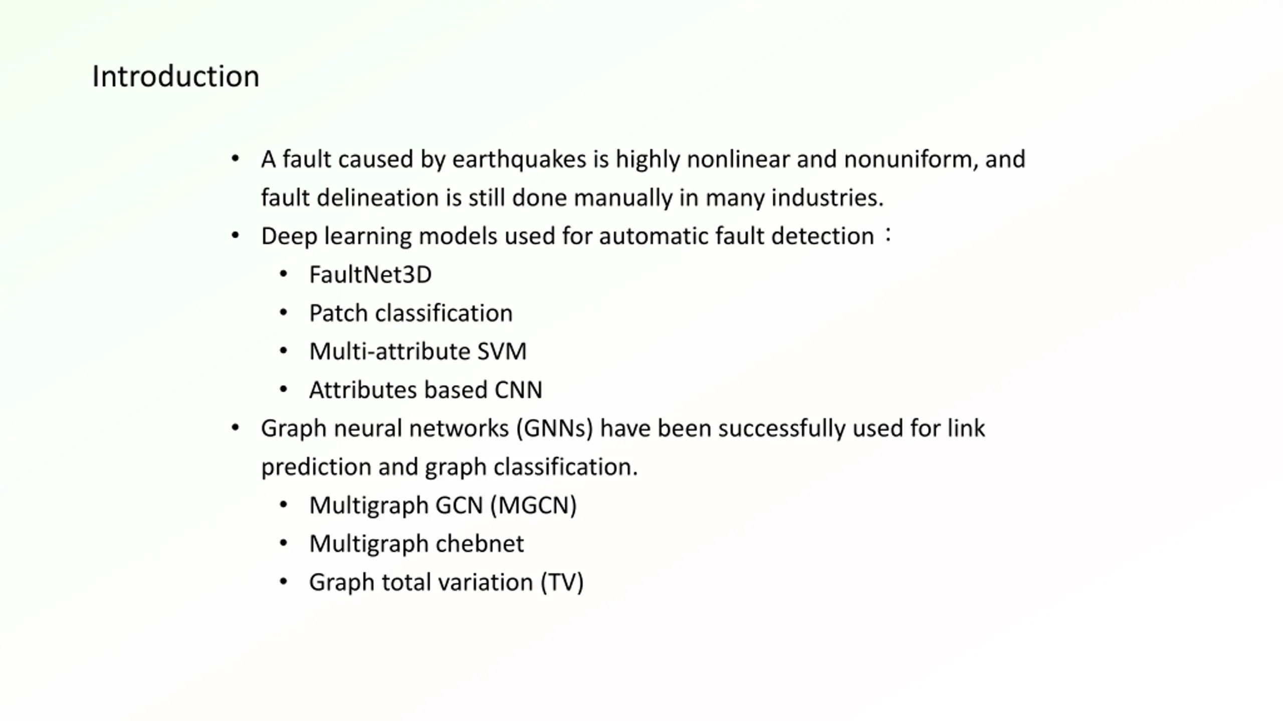 Introduction A fault caused by earthquakes is highly nonlinear and nonuniform, and fault delineation is still done manually in many industries. Deep learning models used for automatic fault detection FaultNet3D Patch classification Multi-attribute SVM Attributes based CNN Graph neural networks (GNNs) have been successfully used for link prediction and graph classification. Multigraph GCN (MGCN) Multigraph chebnet Graph total variation (TV)