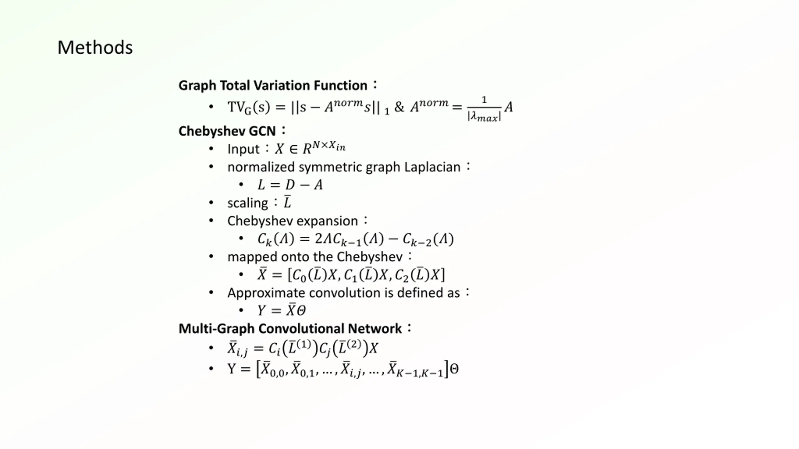 Methods Graph Total Variation Function TVGs = | s ?????? |1& ?????= Chebyshev GCN Input ? ?? ??? normalized symmetric graph Laplacian ? = ? ? scaling ? Chebyshev expansion ??? = 2??? 1? ?? 2(?) mapped onto the Chebyshev ? = ?0 ? ?,?1 ? ?,?2 ? ? Approximate convolution is defined as ? = ?? Multi-Graph Convolutional Network ??,?= ?? ?1?? ?2? Y = ?0,0, ?0,1, , ??,?, , ?? 1,? 1 1 ?????
