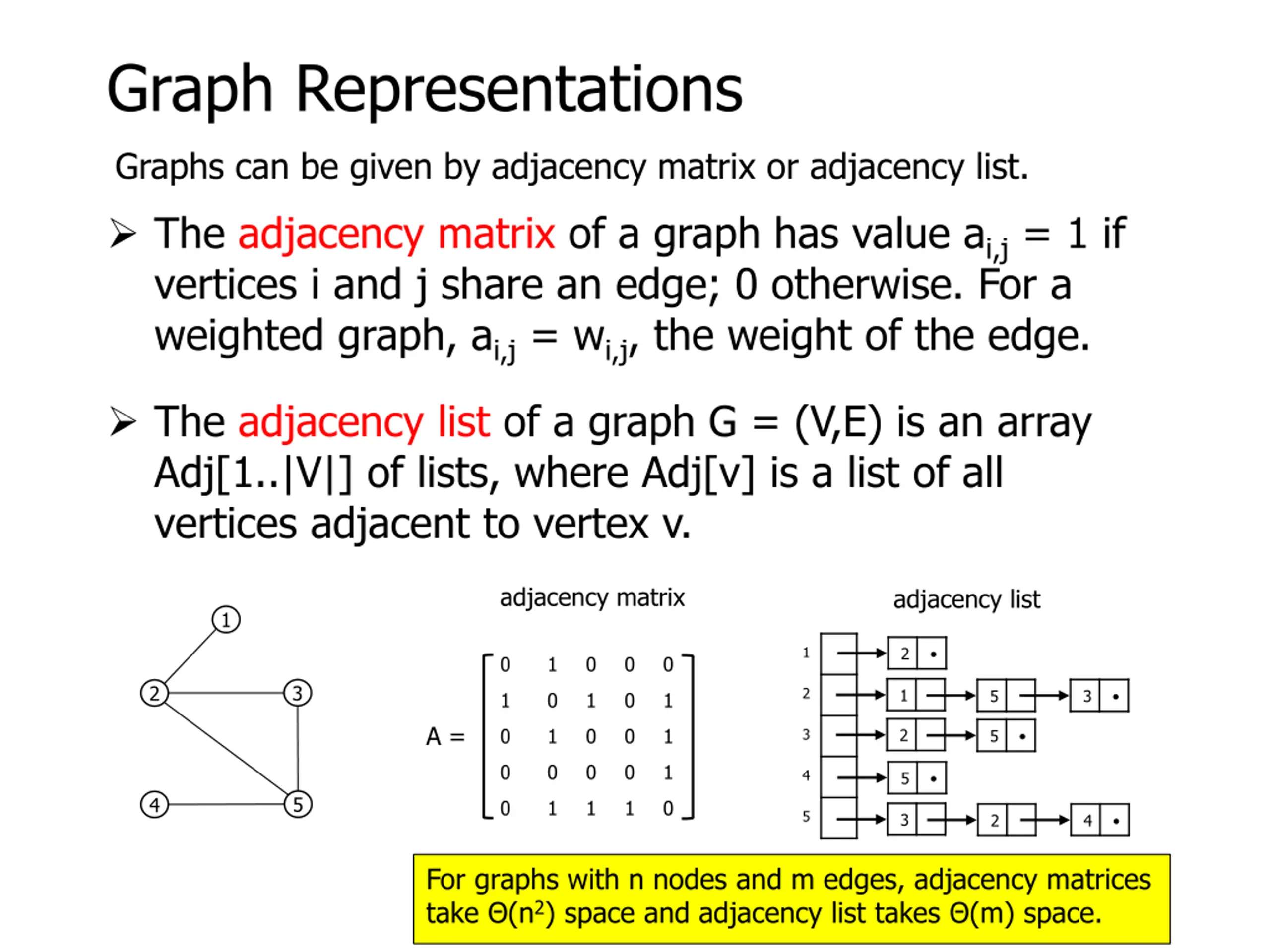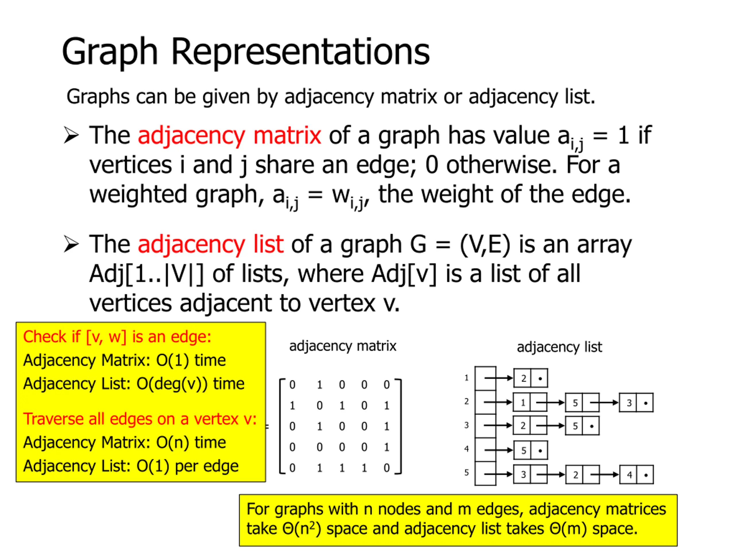 Graph Representations Graphs can be given by adjacency matrix or adjacency list. The adjacency matrix of a graph has value ai,j = 1 if vertices i and j share an edge; 0 otherwise. For a weighted graph, ai,j = wi,j, the weight of the edge. The adjacency list of a graph G = (V,E) is an array Adj[1..|V|] of lists, where Adj[v] is a list of all vertices adjacent to vertex v. adjacency matrix adjacency list 1 1 2 0 1 0 0 0 3 2 2 1 5 3 1 0 1 0 1 A = 0 1 0 0 1 2 3 5 0 0 0 0 1 4 5 5 4 0 1 1 1 0 5 3 2 4