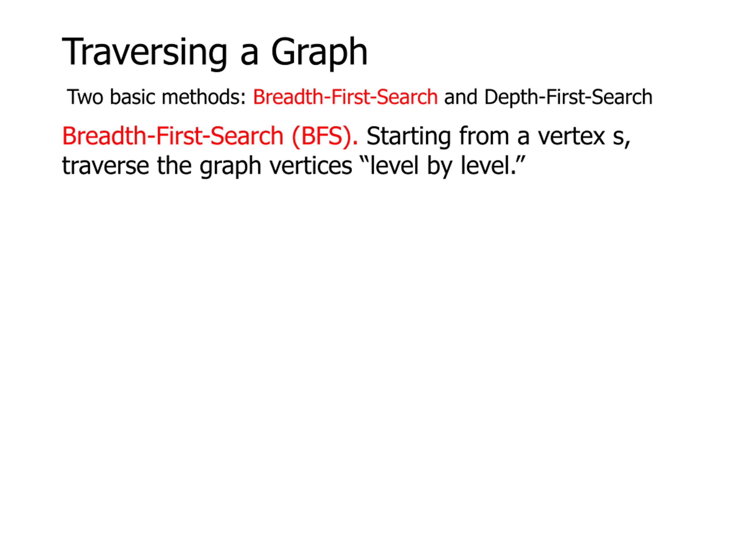 Traversing a Graph Two basic methods: Breadth-First-Search and Depth-First-Search Breadth-First-Search (BFS). Starting from a vertex s, traverse the graph vertices level by level.