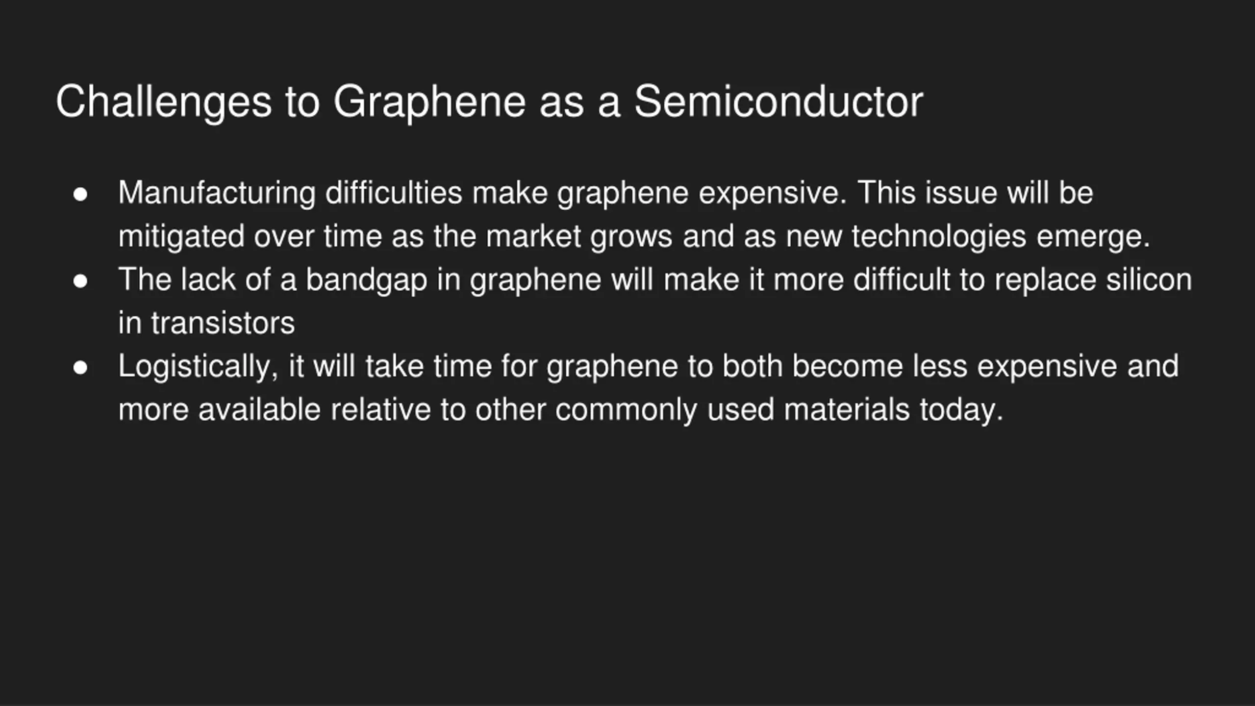 Challenges to Graphene as a Semiconductor Manufacturing difficulties make graphene expensive. This issue will be mitigated over time as the market grows and as new technologies emerge. The lack of a bandgap in graphene will make it more difficult to replace silicon in transistors Logistically, it will take time for graphene to both become less expensive and more available relative to other commonly used materials today.