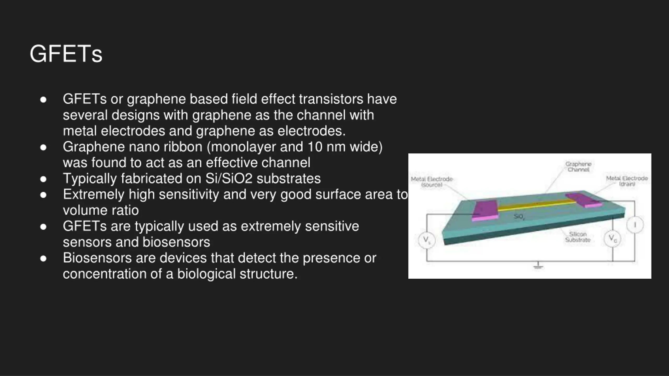 GFETs GFETs or graphene based field effect transistors have several designs with graphene as the channel with metal electrodes and graphene as electrodes. Graphene nano ribbon (monolayer and 10 nm wide) was found to act as an effective channel Typically fabricated on Si/SiO2 substrates Extremely high sensitivity and very good surface area to volume ratio GFETs are typically used as extremely sensitive sensors and biosensors Biosensors are devices that detect the presence or concentration of a biological structure.
