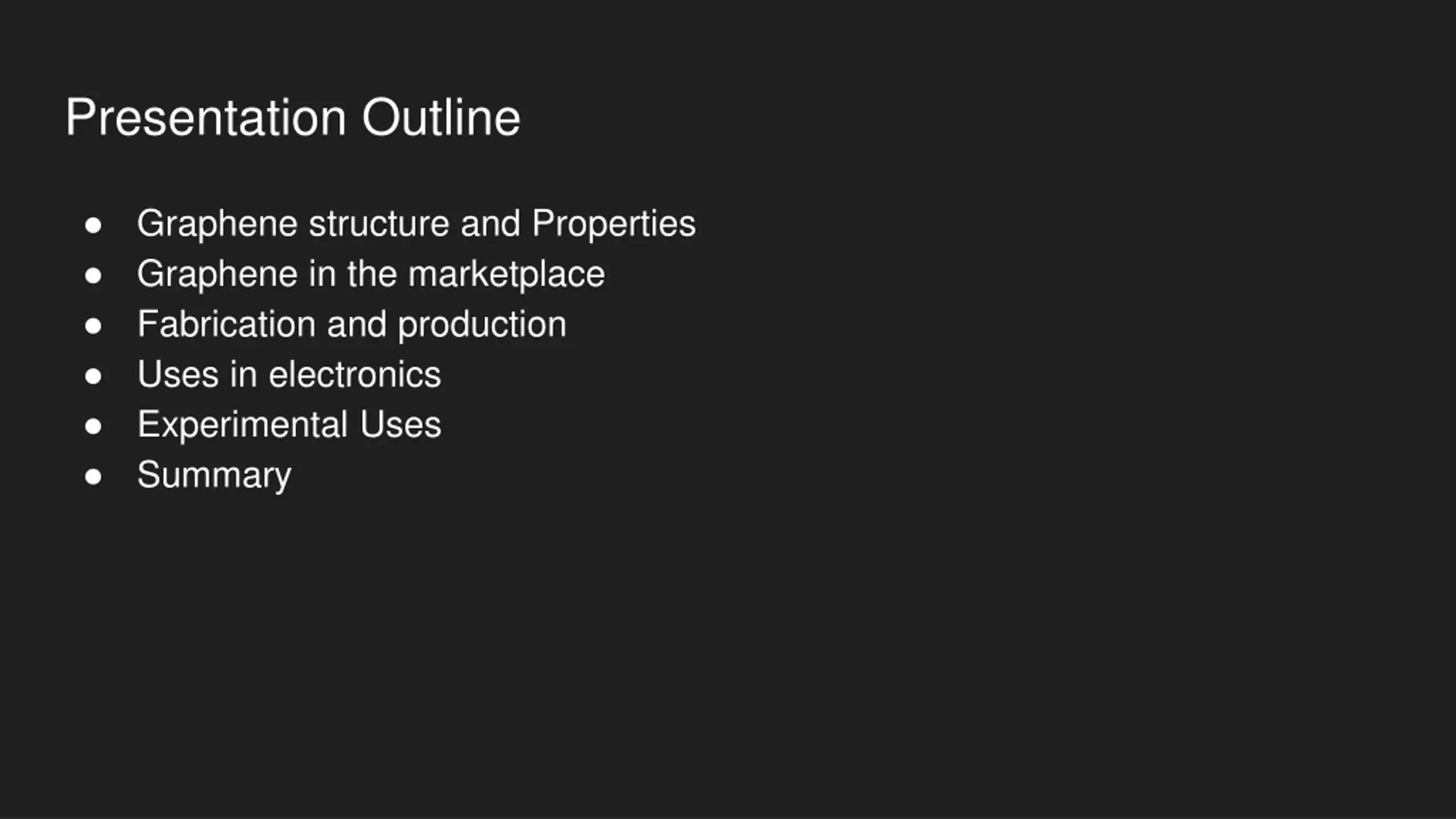 Presentation Outline Graphene structure and Properties Graphene in the marketplace Fabrication and production Uses in electronics Experimental Uses Summary