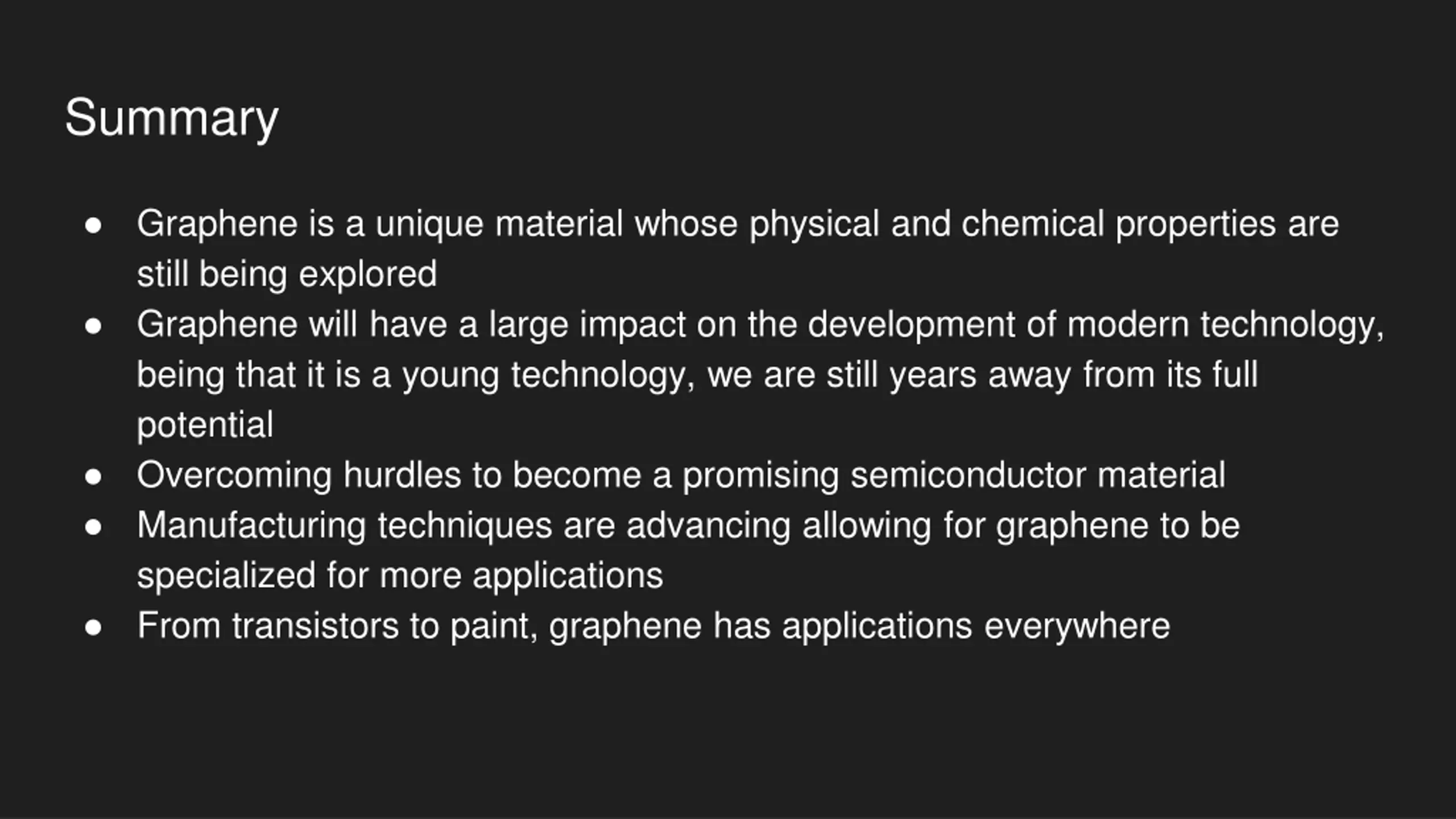 Summary Graphene is a unique material whose physical and chemical properties are still being explored Graphene will have a large impact on the development of modern technology, being that it is a young technology, we are still years away from its full potential Overcoming hurdles to become a promising semiconductor material Manufacturing techniques are advancing allowing for graphene to be specialized for more applications From transistors to paint, graphene has applications everywhere