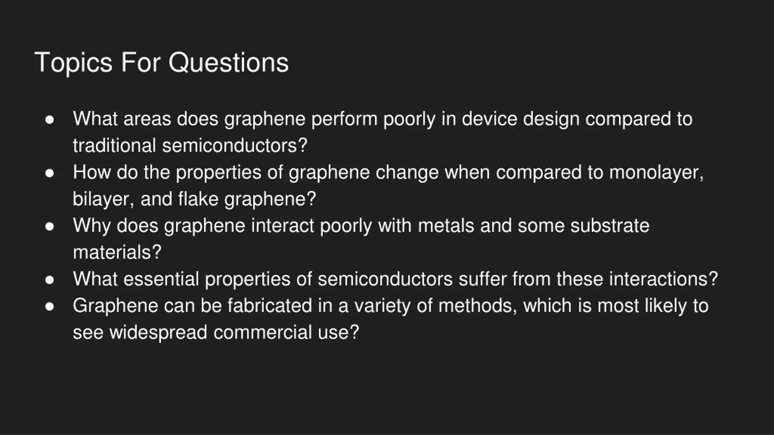 Topics For Questions What areas does graphene perform poorly in device design compared to traditional semiconductors? How do the properties of graphene change when compared to monolayer, bilayer, and flake graphene? Why does graphene interact poorly with metals and some substrate materials? What essential properties of semiconductors suffer from these interactions? Graphene can be fabricated in a variety of methods, which is most likely to see widespread commercial use?