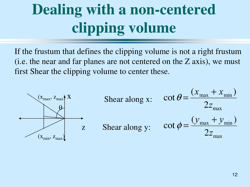 Dealing with a non-centered clipping volume If the frustum that defines the clipping volume is not a right frustum (i.e. the near and far planes are not centered on the Z axis), we must first Shear the clipping volume to center these. cotq =(xmax+ xmin) x (xmax, zmax) Shear along x: 2zmax cotf =(ymax+ ymin) z Shear along y: 2zmax (xmin, zmax) 12