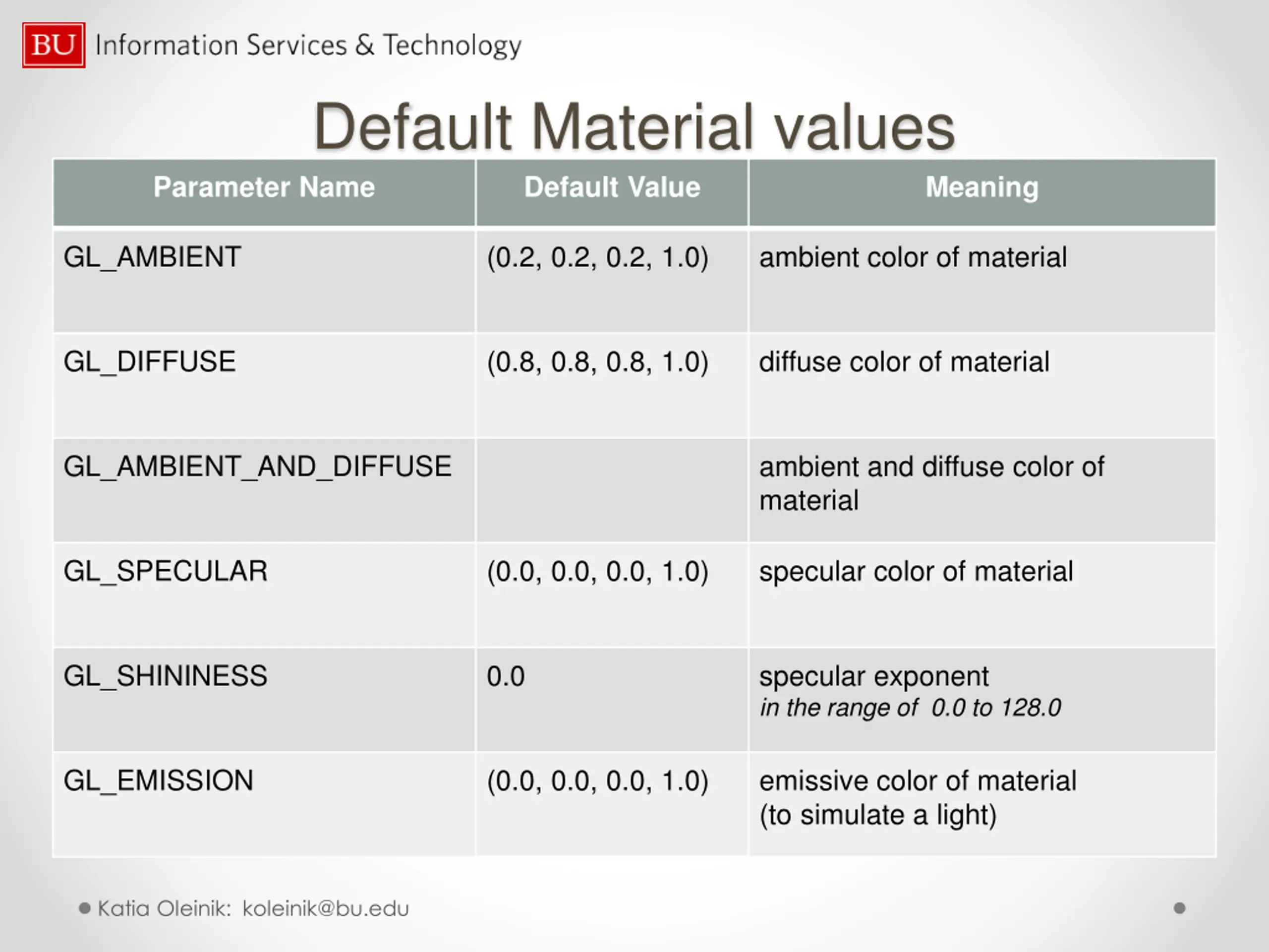 Default Material values Parameter Name Default Value Meaning GL_AMBIENT (0.2, 0.2, 0.2, 1.0) ambient color of material GL_DIFFUSE (0.8, 0.8, 0.8, 1.0) diffuse color of material GL_AMBIENT_AND_DIFFUSE ambient and diffuse color of material GL_SPECULAR (0.0, 0.0, 0.0, 1.0) specular color of material GL_SHININESS 0.0 specular exponent in the range of 0.0 to 128.0 GL_EMISSION (0.0, 0.0, 0.0, 1.0) emissive color of material (to simulate a light) Katia Oleinik: koleinik@bu.edu