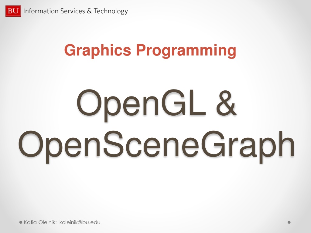 Graphics Programming OpenGL OpenSceneGraph Low-level API Higher level, built upon OpenGL cross-language Written in standard C++ cross-platform Windows, Linux, Mac and few more 2D, 3D computer graphics 2D, 3D computer graphics Katia Oleinik: koleinik@bu.edu