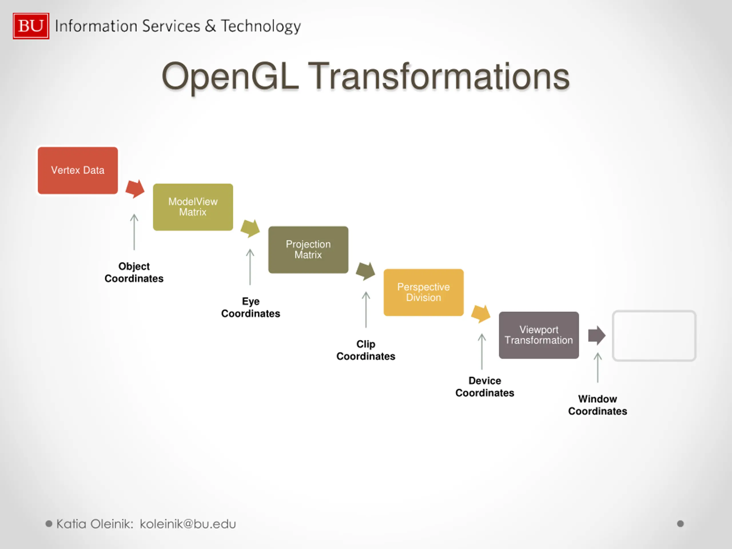 OpenGL Transformations Vertex Data ModelView Matrix Projection Matrix Object Coordinates Perspective Division Eye Coordinates Viewport Transformation Clip Coordinates Device Coordinates Window Coordinates Katia Oleinik: koleinik@bu.edu