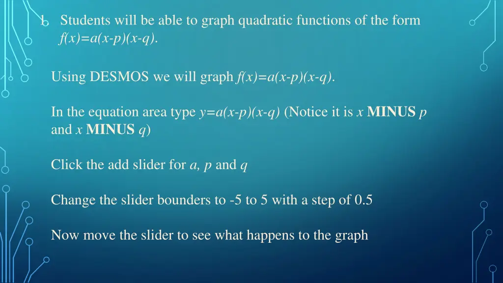 1. Students will be able to graph quadratic functions of the form f(x)=a(x-p)(x-q). Using DESMOS we will graph f(x)=a(x-p)(x-q). In the equation area type y=a(x-p)(x-q) (Notice it is xMINUSp and xMINUSq) Click the add slider for a,p and q Change the slider bounders to -5 to 5 with a step of 0.5 Now move the slider to see what happens to the graph