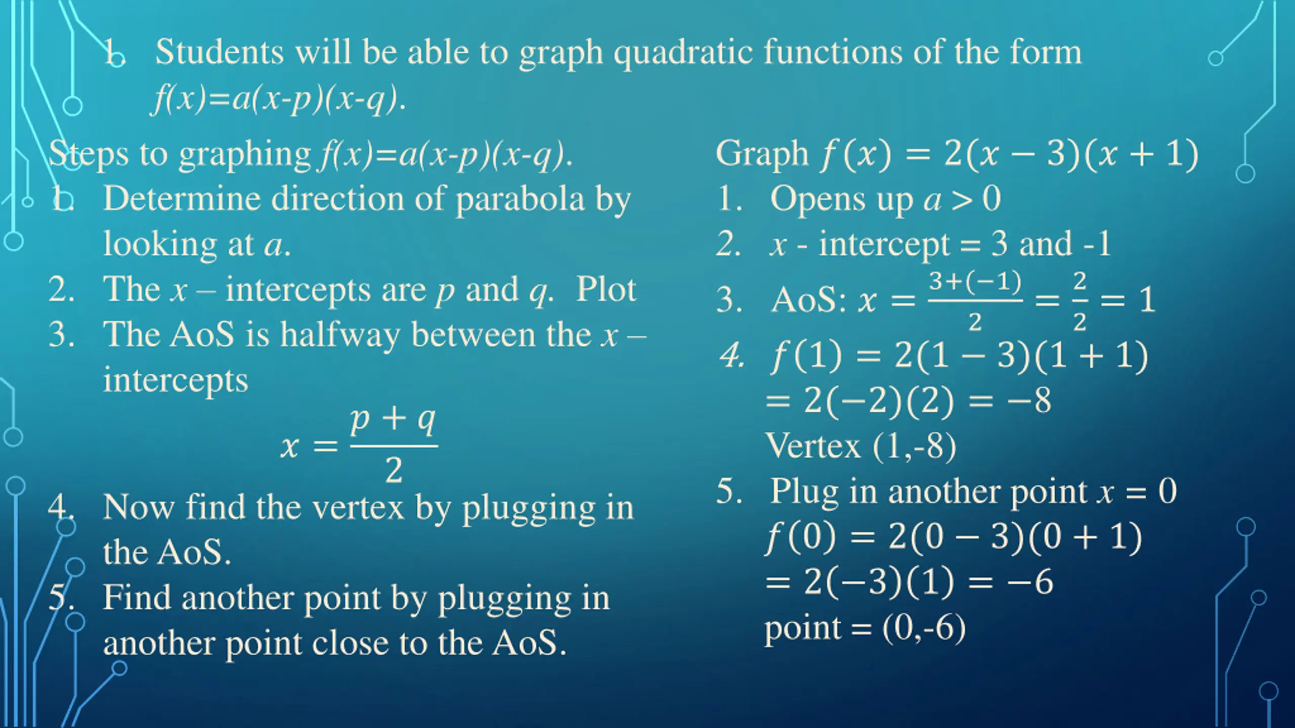 1. Students will be able to graph quadratic functions of the form f(x)=a(x-p)(x-q). Steps to graphing ? ? = ?(? ?)(? ?) 1. Determine direction of parabola by looking at a. 2. The x intercepts are p and q. Plot 3. The AoS is halfway between the x intercepts ? =? + ? 2 4. Now find the vertex by plugging in the AoS. 5. Find another point by plugging in another x close to the AoS.
