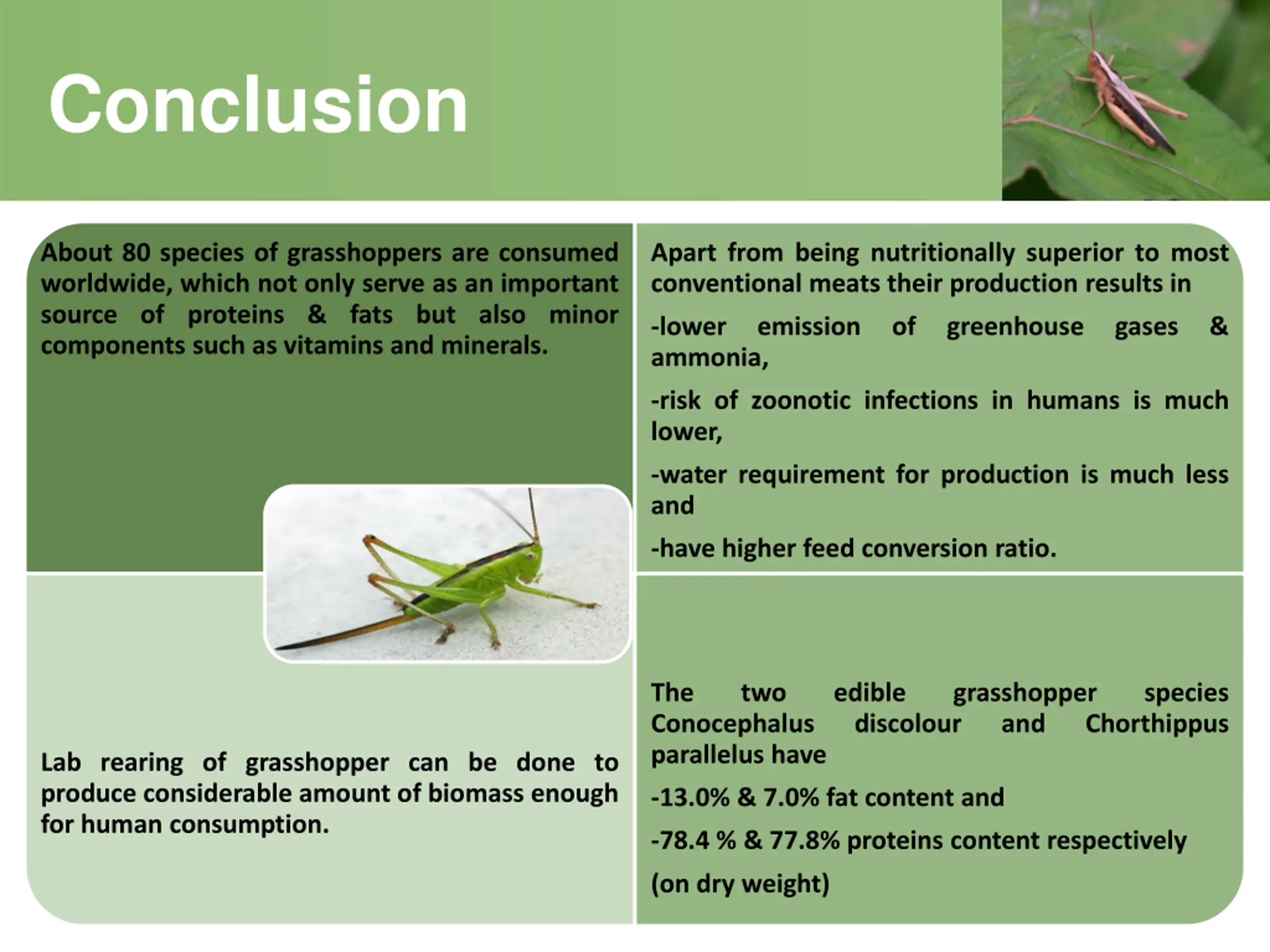 Conclusion About 80 species of grasshoppers are consumed worldwide, which not only serve as an important source of proteins & fats but also minor components such as vitamins and minerals. Apart from being nutritionally superior to most conventional meats their production results in -lower emission of greenhouse gases & ammonia, -risk of zoonotic infections in humans is much lower, -water requirement for production is much less and -have higher feed conversion ratio. The Conocephalus parallelus have two edible discolour grasshopper and species Chorthippus Lab rearing of grasshopper can be done to produce considerable amount of biomass enough for human consumption. -13.0% & 7.0% fat content and -78.4 % & 77.8% proteins content respectively (on dry weight)