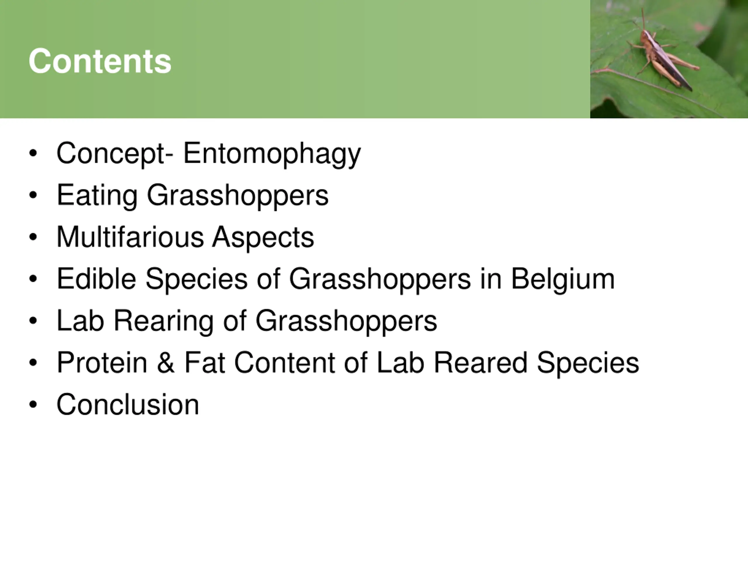 Contents Concept- Entomophagy Eating Grasshoppers Multifarious Aspects Edible Species of Grasshoppers in Belgium Lab Rearing of Grasshoppers Protein & Fat Content of Lab Reared Species Conclusion