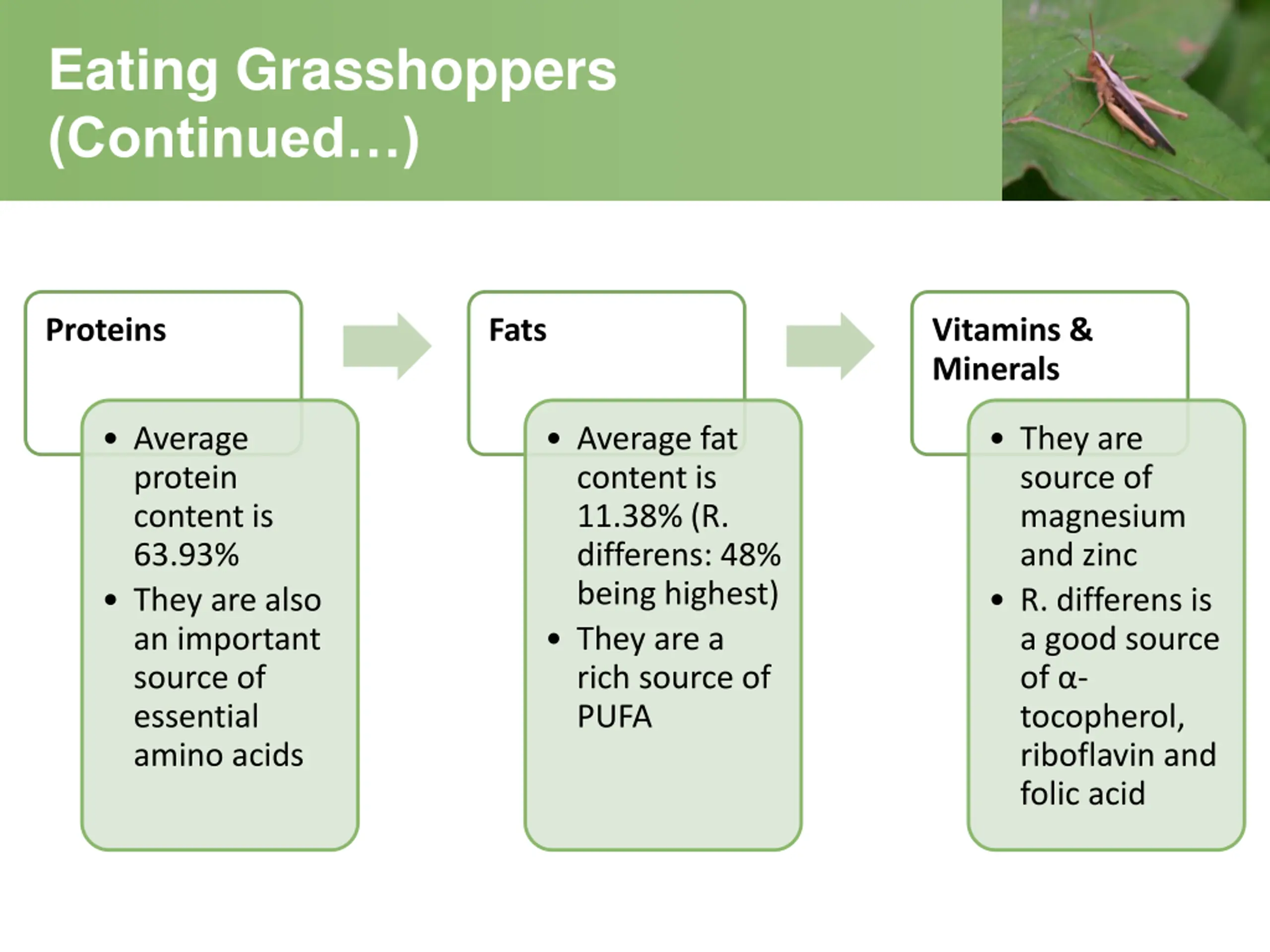 Eating Grasshoppers (Continued ) Proteins Fats Vitamins & Minerals Average protein content is 63.93% They are also an important source of essential amino acids Average fat content is 11.38% (R. differens: 48% being highest) They are a rich source of PUFA They are source of magnesium and zinc R. differens is a good source of - tocopherol, riboflavin and folic acid
