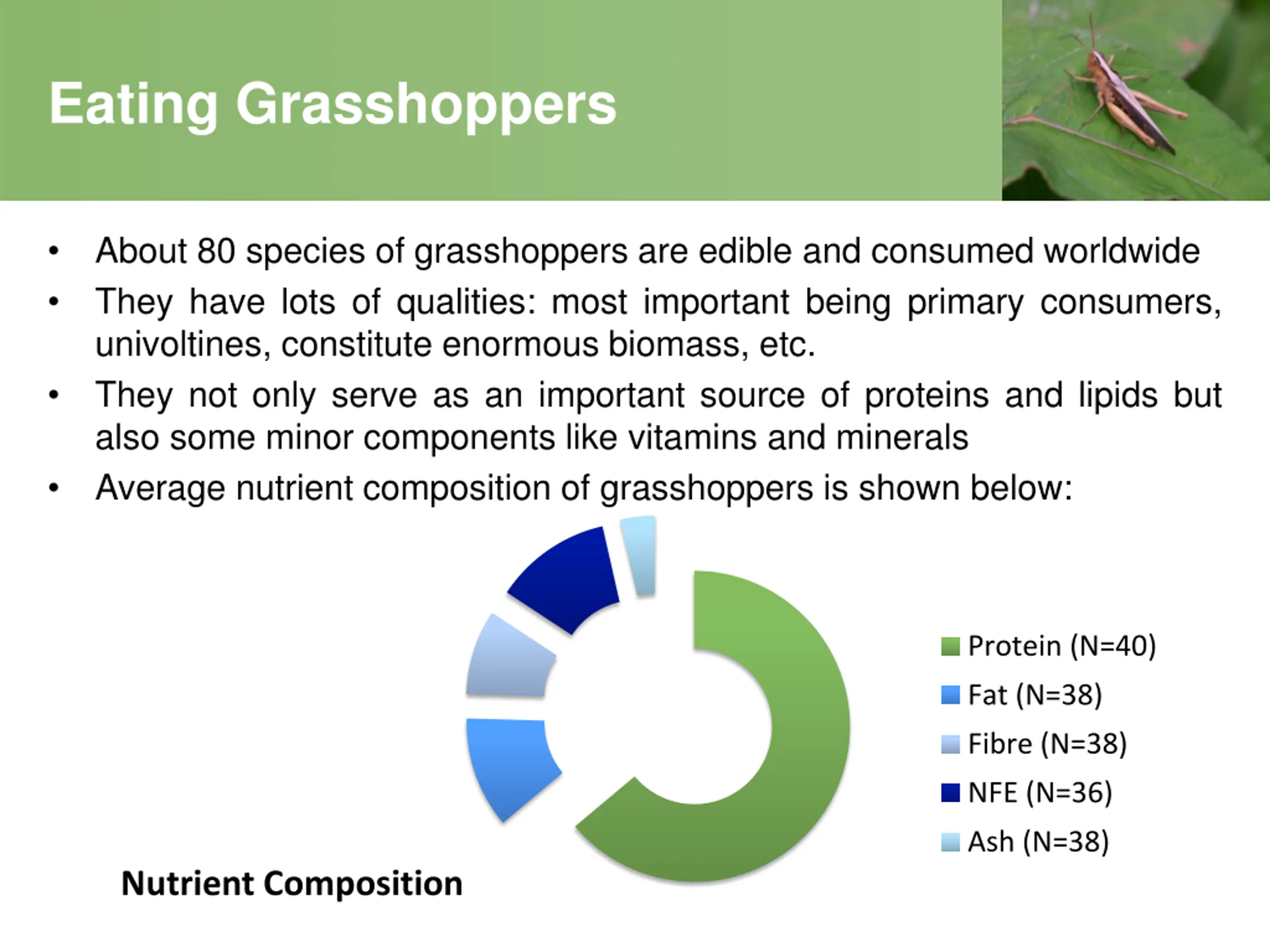 Eating Grasshoppers About 80 species of grasshoppers are edible and consumed worldwide They have lots of qualities: most important being primary consumers, univoltines, constitute enormous biomass, etc. They not only serve as an important source of proteins and lipids but also some minor components like vitamins and minerals Average nutrient composition of grasshoppers is shown below: Protein (N=40) Fat (N=38) Fibre (N=38) NFE (N=36) Ash (N=38) Nutrient Composition