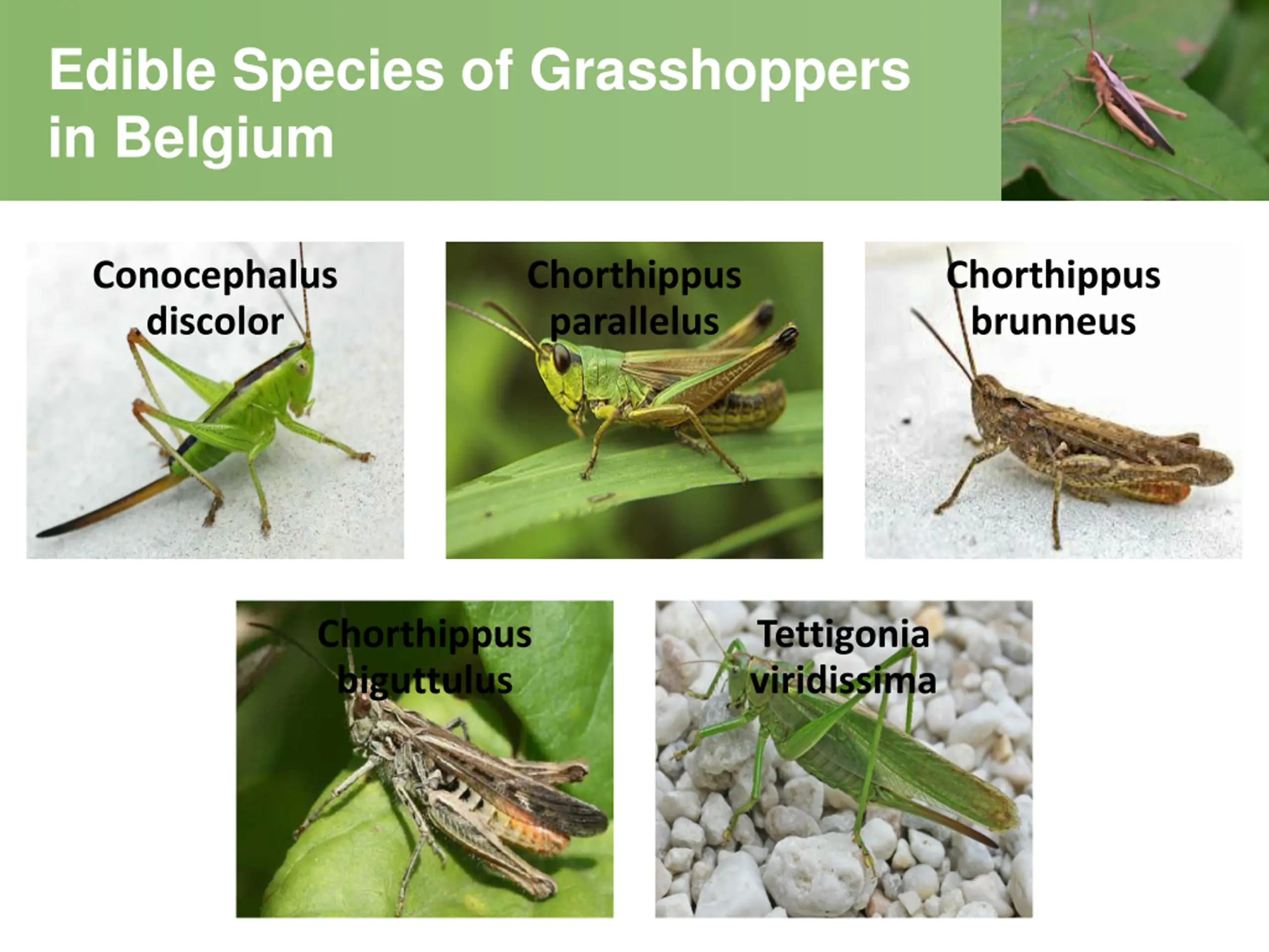 Edible Species of Grasshoppers in Belgium Conocephalus discolor Chorthippus parallelus Chorthippus brunneus Chorthippus biguttulus Tettigonia viridissima