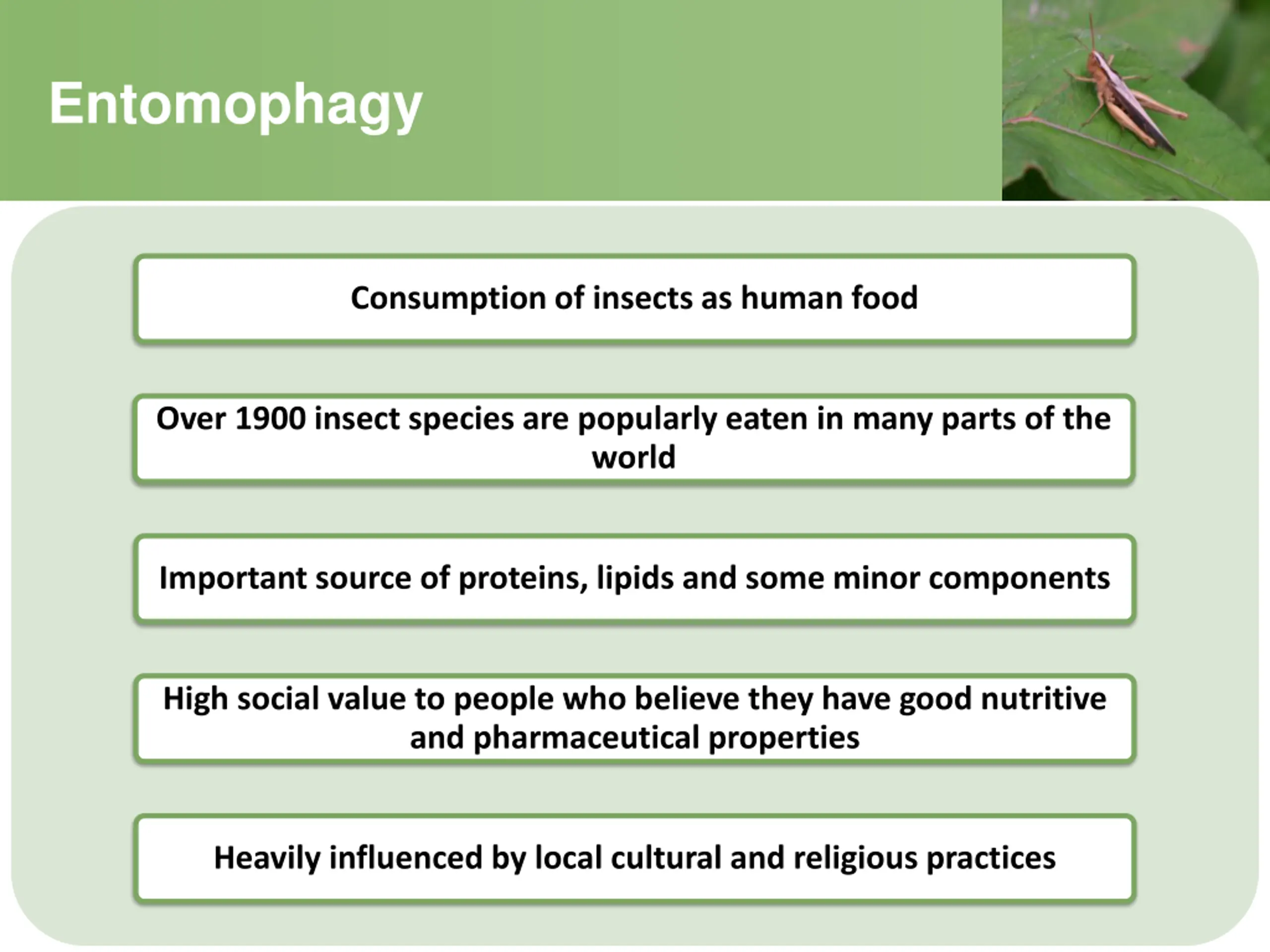 Entomophagy Consumption of insects as human food Over 1900 insect species are popularly eaten in many parts of the world Important source of proteins, lipids and some minor components High social value to people who believe they have good nutritive and pharmaceutical properties Heavily influenced by local cultural and religious practices