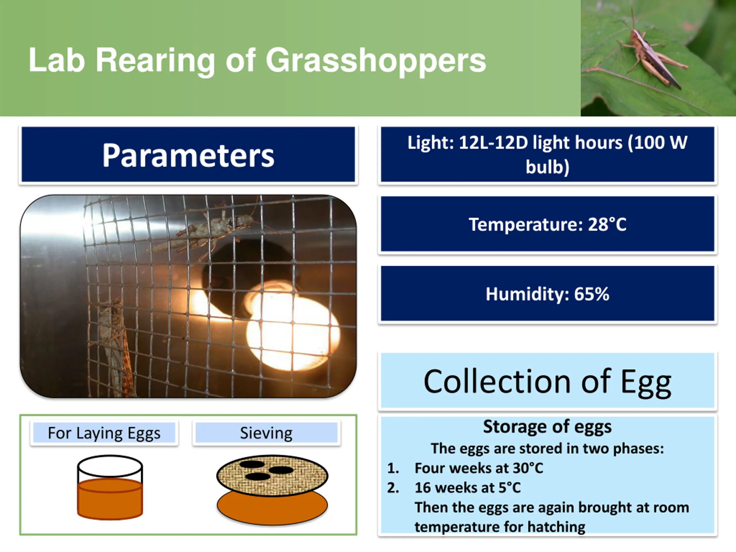 Lab Rearing of Grasshoppers Light: 12L-12D light hours (100 W bulb) Parameters Temperature: 28 C Humidity: 65% Collection of Egg Storage of eggs The eggs are stored in two phases: Four weeks at 30 C 16 weeks at 5 C Then the eggs are again brought at room temperature for hatching For Laying Eggs Sieving 1. 2.