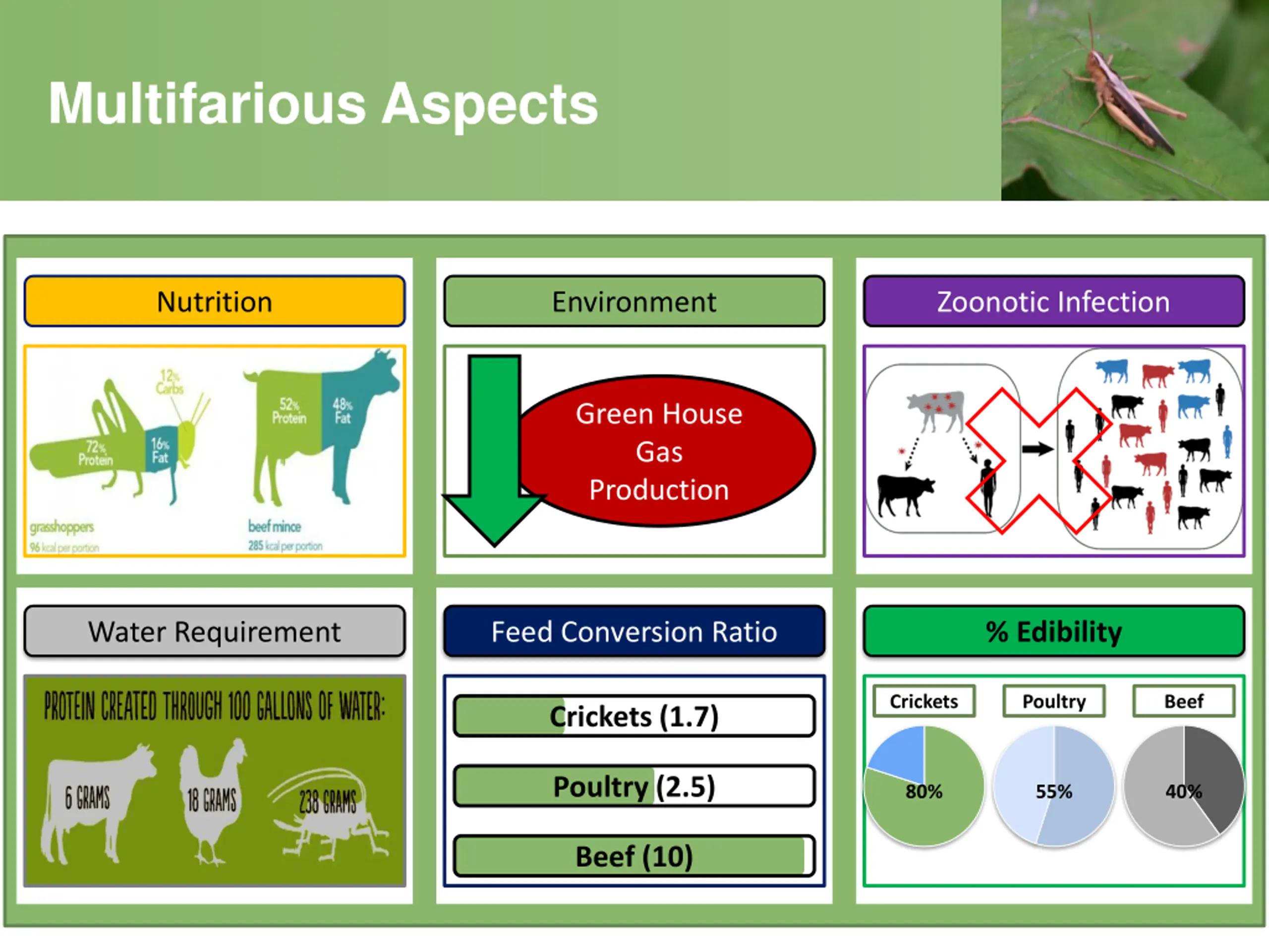 Multifarious Aspects Nutrition Environment Zoonotic Infection Green House Gas Production Water Requirement Feed Conversion Ratio % Edibility Crickets Poultry Beef Crickets (1.7) Poultry (2.5) 80% 55% 40% Beef (10)