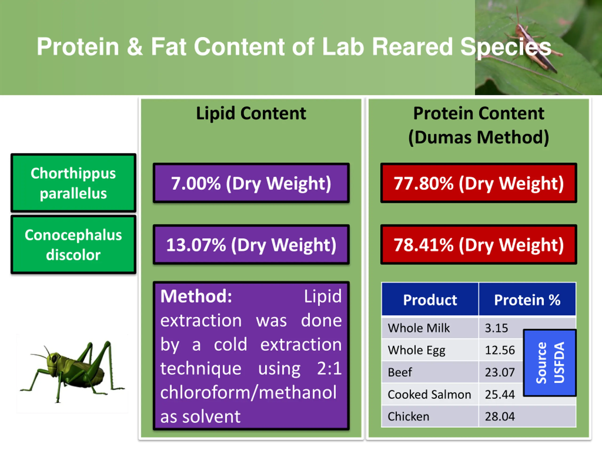 Protein & Fat Content of Lab Reared Species Lipid Content Protein Content (Dumas Method) Chorthippus parallelus 7.00% (Dry Weight) 77.80% (Dry Weight) Conocephalus discolor 13.07% (Dry Weight) 78.41% (Dry Weight) Method: extraction was done by a cold extraction technique using 2:1 chloroform/methanol as solvent Lipid Product Protein % Whole Milk 3.15 Source USFDA Whole Egg 12.56 Beef 23.07 Cooked Salmon 25.44 Chicken 28.04