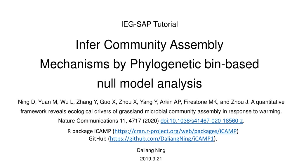 IEG-SAP Tutorial Infer Community Assembly Mechanisms by Phylogenetic bin-based null model analysis Ning D, Yuan M, Wu L, Zhang Y, Guo X, Zhou X, Yang Y, Arkin AP, Firestone MK, and Zhou J. A quantitative framework reveals ecological drivers of grassland microbial community assembly in response to warming. Nature Communications 11, 4717 (2020) doi:10.1038/s41467-020-18560-z. R package iCAMP (https://cran.r-project.org/web/packages/iCAMP) GitHub (https://github.com/DaliangNing/iCAMP1). Daliang Ning 2019.9.21