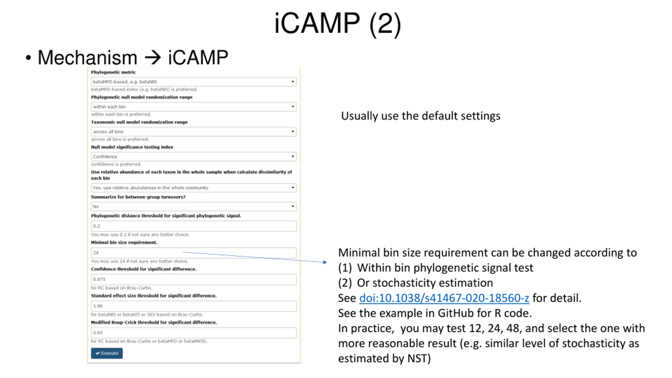 iCAMP (2) Mechanism iCAMP Usually use the default settings Minimal bin size requirement can be changed according to (1) Within bin phylogenetic signal test (2) Or stochasticity estimation See doi:10.1038/s41467-020-18560-z for detail. See the example in GitHub for R code. In practice, you may test 12, 24, 48, and select the one with more reasonable result (e.g. similar level of stochasticity as estimated by NST)