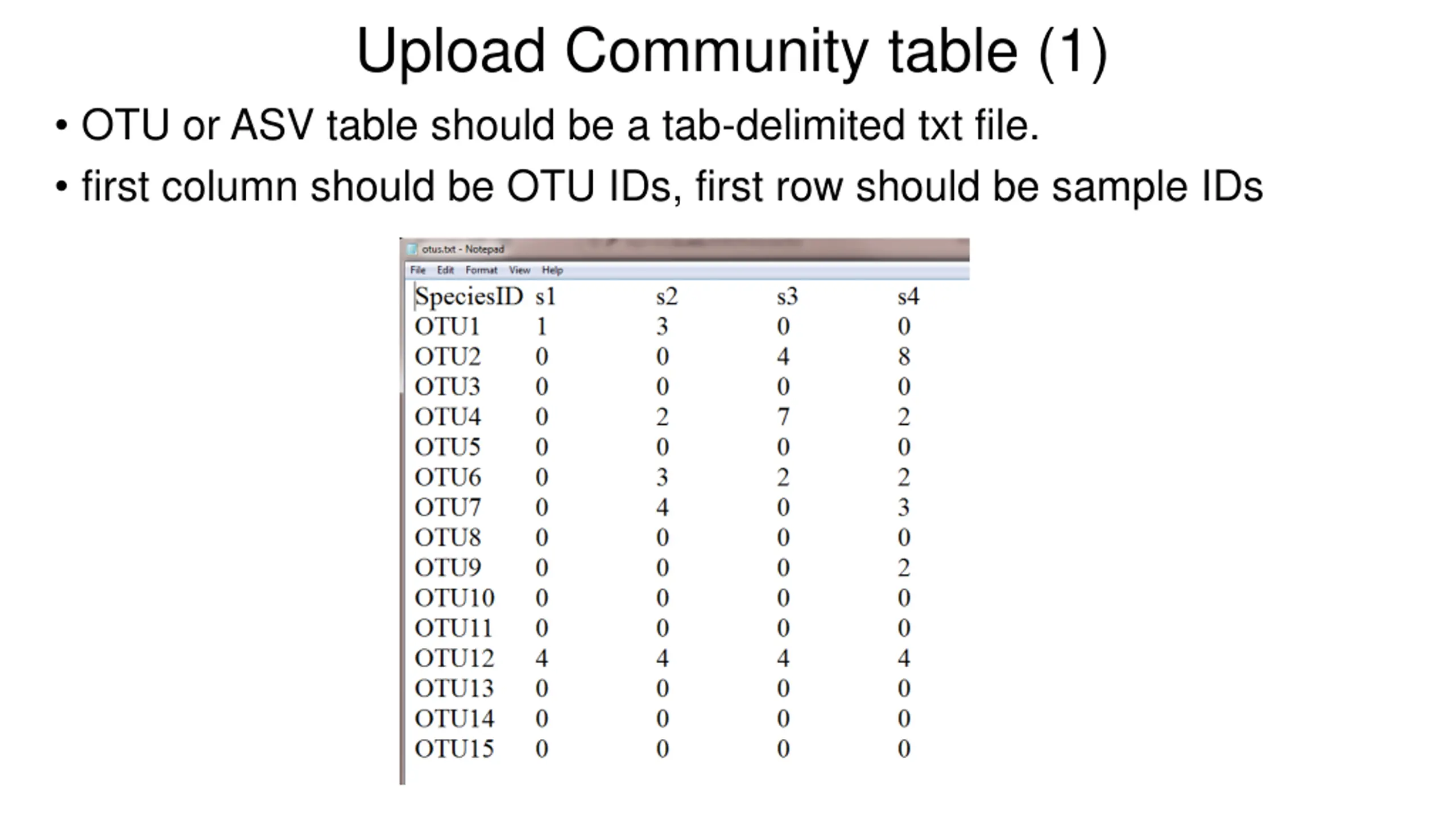 Upload Community table (1) OTU or ASV table should be a tab-delimited txt file. first column should be OTU IDs, first row should be sample IDs