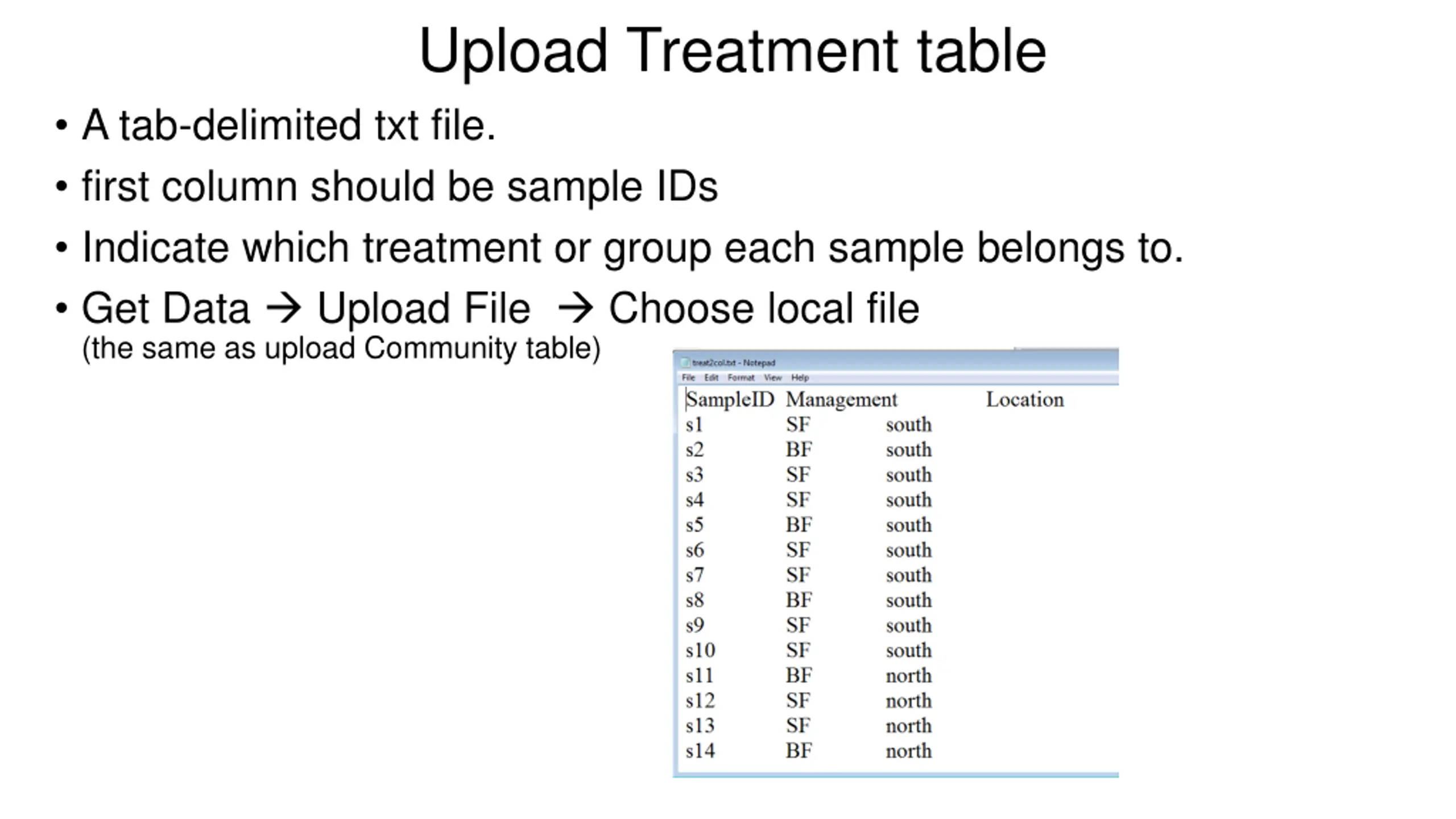 Upload Treatment table A tab-delimited txt file. first column should be sample IDs Indicate which treatment or group each sample belongs to. Get Data Upload File Choose local file (the same as upload Community table)