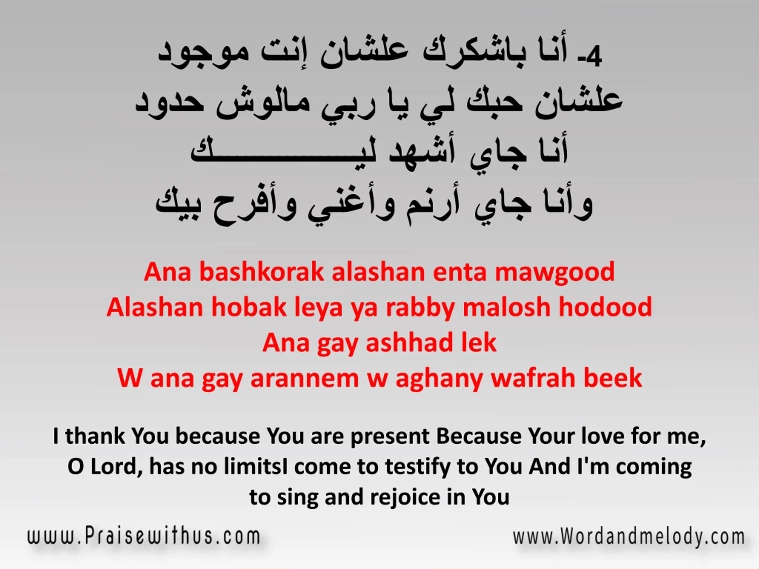 4 - Ana bashkorak alashan enta mawgood Alashan hobak leya ya rabby malosh hodood Ana gay ashhad lek W ana gay arannem w aghany wafrah beek I thank You because You are present Because Your love for me, O Lord, has no limitsI come to testify to You And I'm coming to sing and rejoice in You