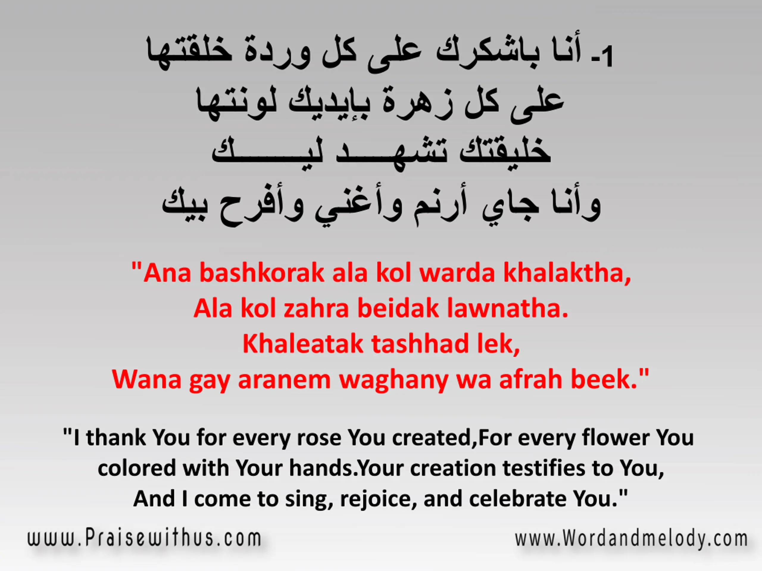 1 - "Ana bashkorak ala kol warda khalaktha, Ala kol zahra beidak lawnatha. Khaleatak tashhad lek, Wana gay aranem waghany wa afrah beek." "I thank You for every rose You created,For every flower You colored with Your hands.Your creation testifies to You, And I come to sing, rejoice, and celebrate You."