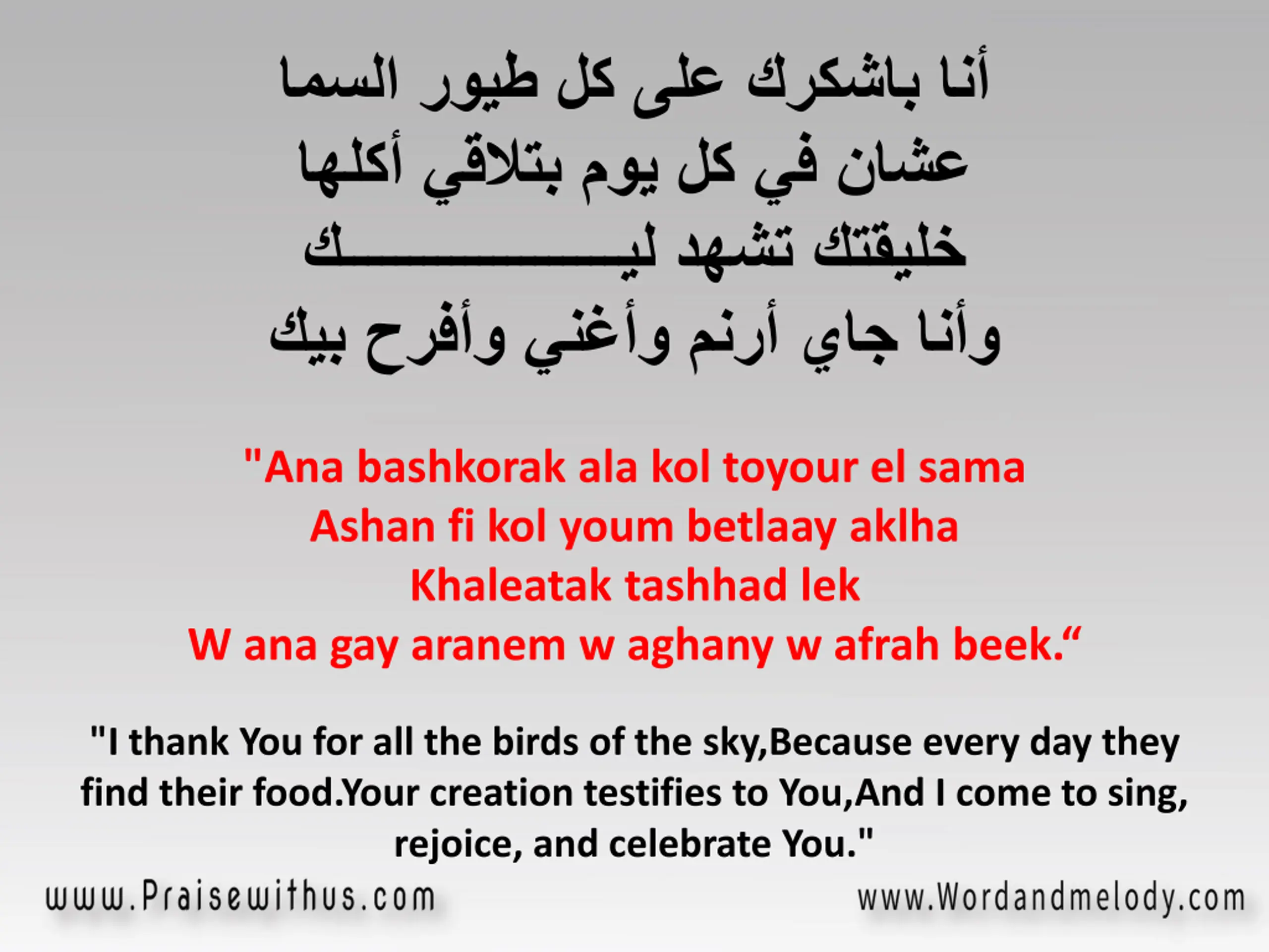 "Ana bashkorak ala kol toyour el sama Ashan fi kol youm betlaay aklha Khaleatak tashhad lek W ana gay aranem w aghany w afrah beek. "I thank You for all the birds of the sky,Because every day they find their food.Your creation testifies to You,And I come to sing, rejoice, and celebrate You."
