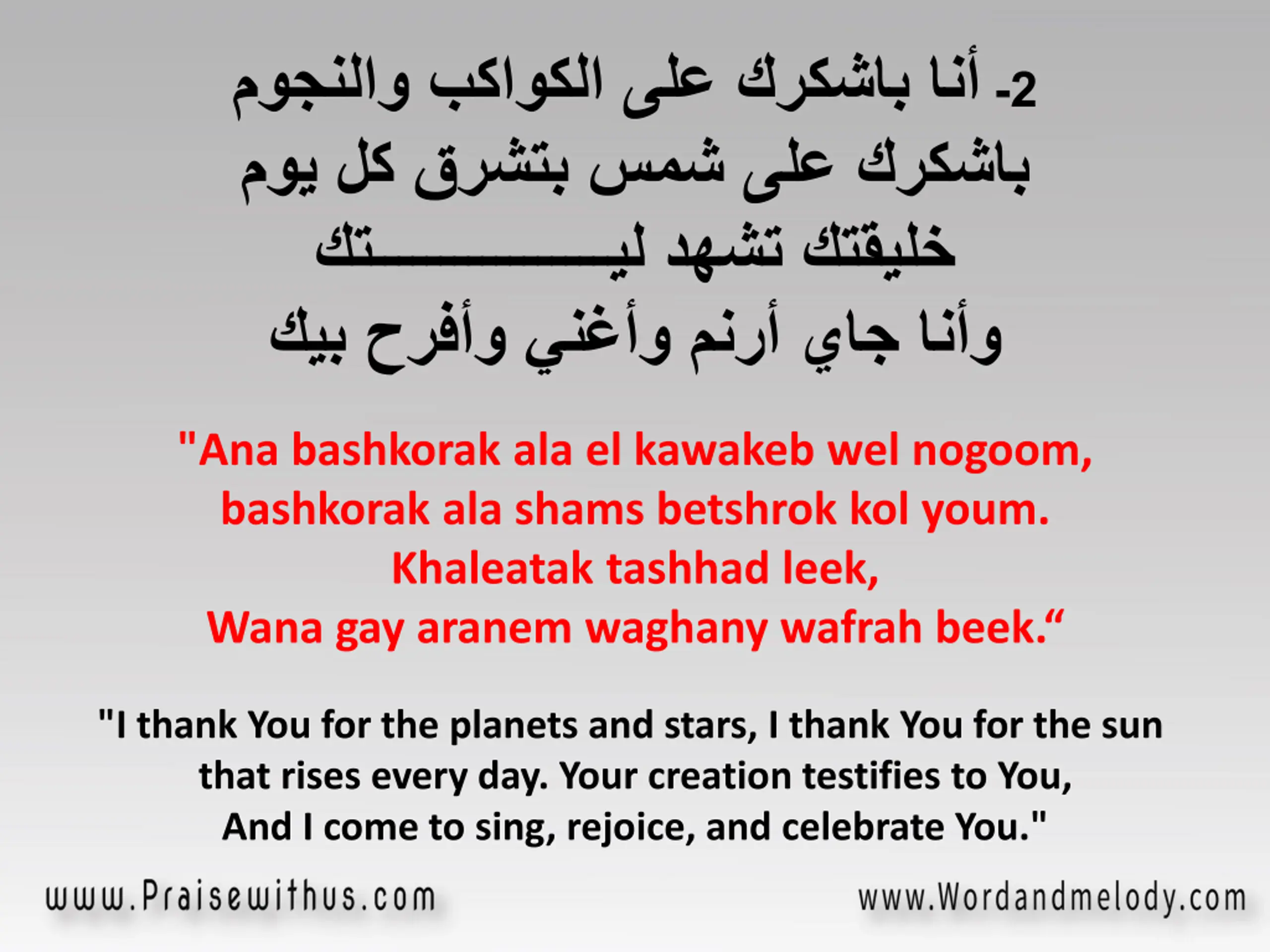 2 - "Ana bashkorak ala el kawakeb wel nogoom, bashkorak ala shams betshrok kol youm. Khaleatak tashhad leek, Wana gay aranem waghany wafrah beek. "I thank You for the planets and stars, I thank You for the sun that rises every day. Your creation testifies to You, And I come to sing, rejoice, and celebrate You."