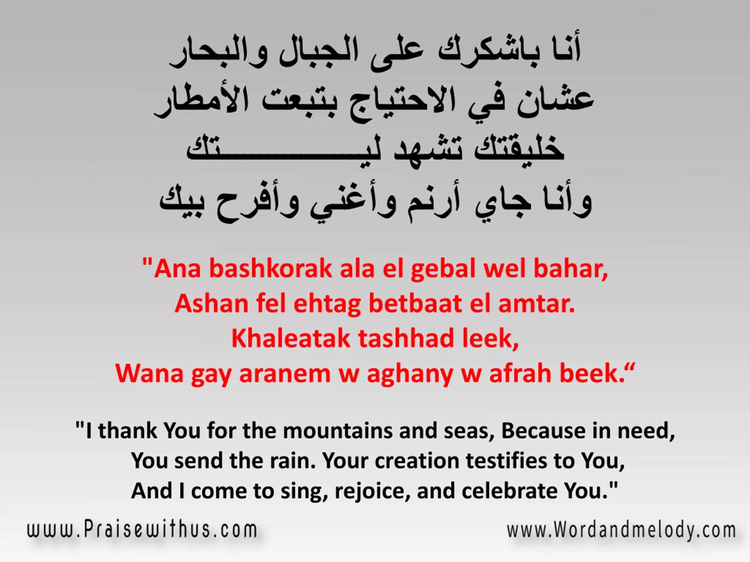"Ana bashkorak ala el gebal wel bahar, Ashan fel ehtag betbaat el amtar. Khaleatak tashhad leek, Wana gay aranem w aghany w afrah beek. "I thank You for the mountains and seas, Because in need, You send the rain. Your creation testifies to You, And I come to sing, rejoice, and celebrate You."