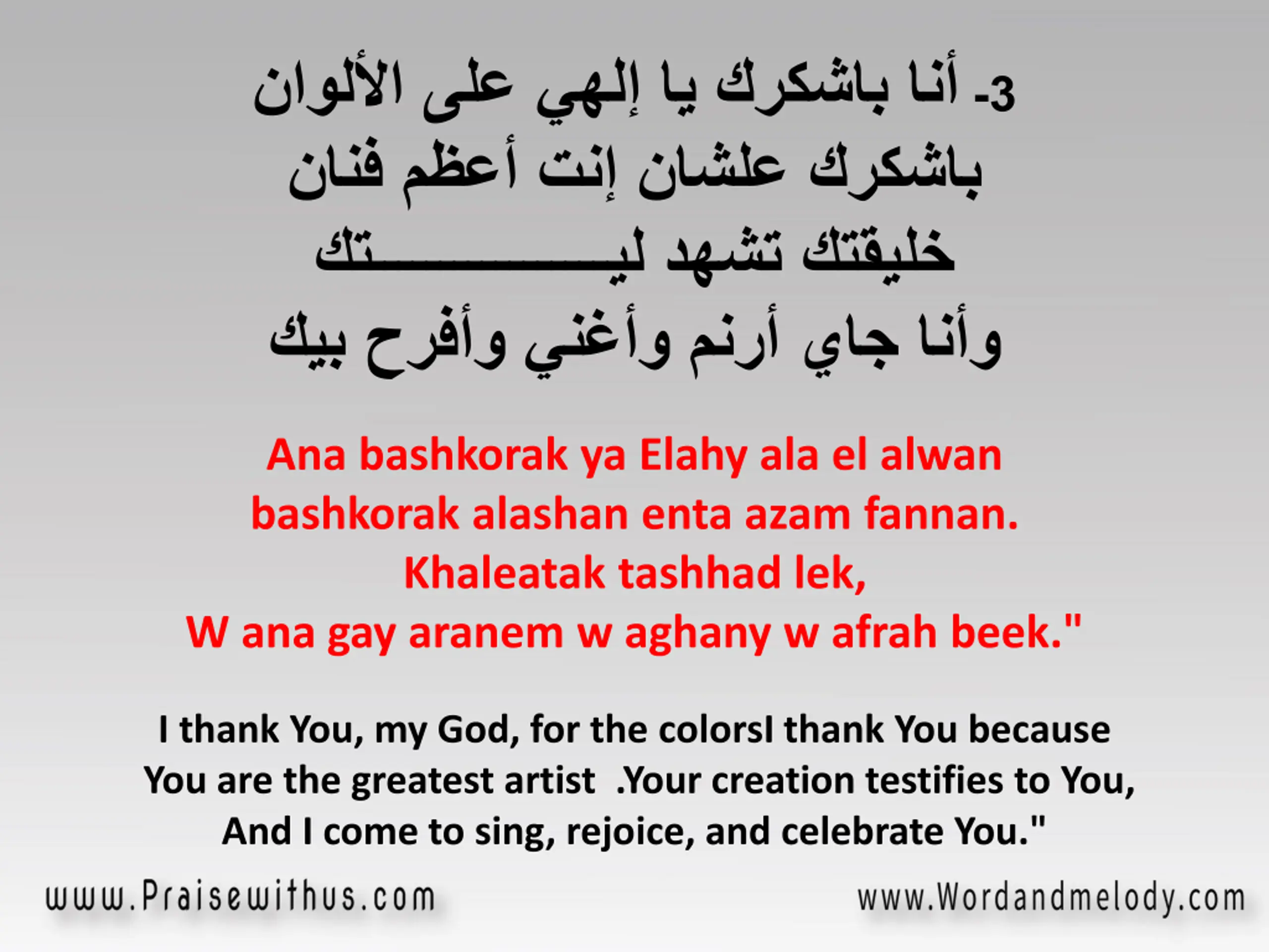 3 - Ana bashkorak ya Elahy ala el alwan bashkorak alashan enta azam fannan. Khaleatak tashhad lek, W ana gay aranem w aghany w afrah beek." I thank You, my God, for the colorsI thank You because You are the greatest artist .Your creation testifies to You, And I come to sing, rejoice, and celebrate You."