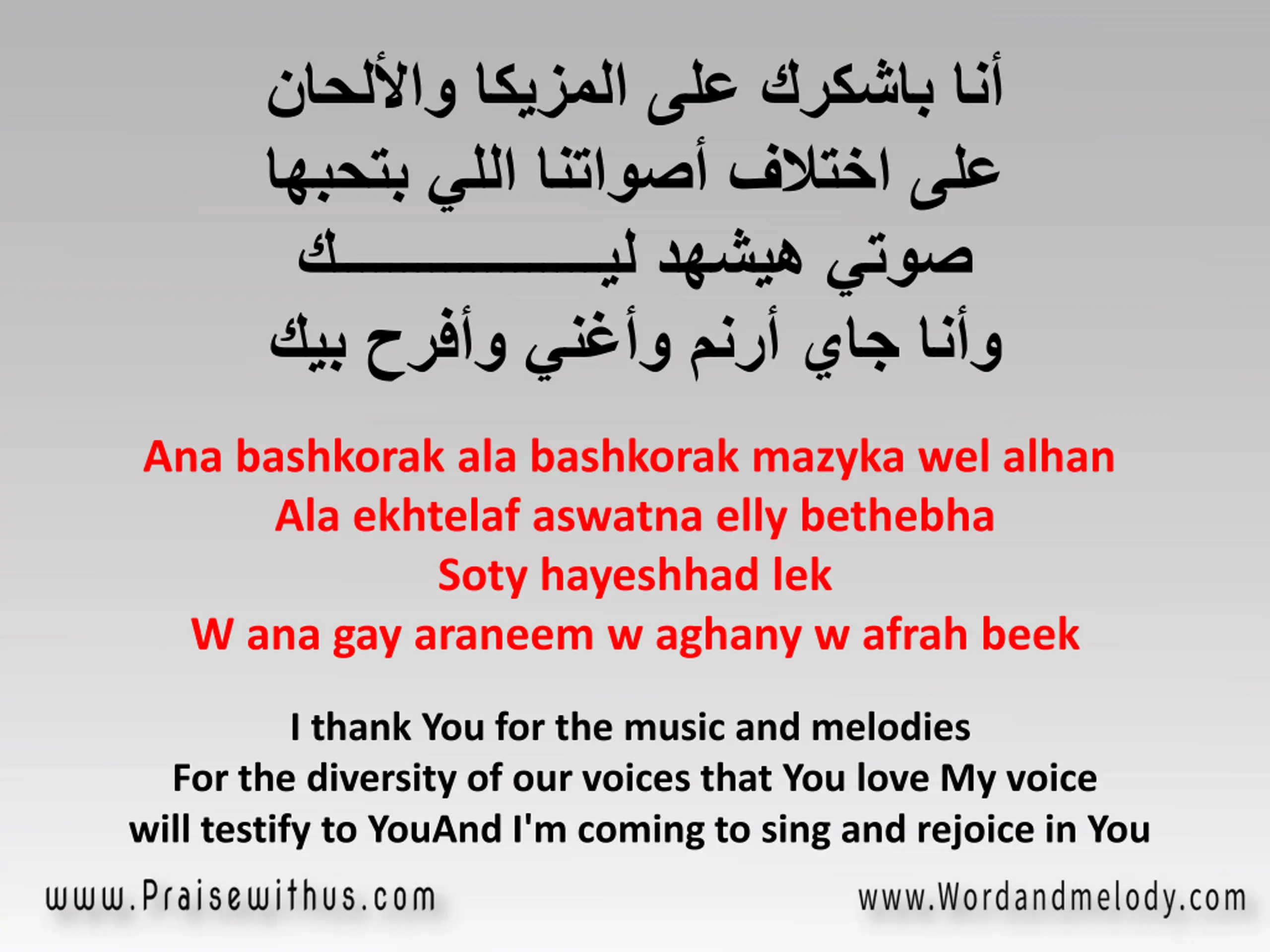 Ana bashkorak ala bashkorak mazyka wel alhan Ala ekhtelaf aswatna elly bethebha Soty hayeshhad lek W ana gay araneem w aghany w afrah beek I thank You for the music and melodies For the diversity of our voices that You love My voice will testify to YouAnd I'm coming to sing and rejoice in You