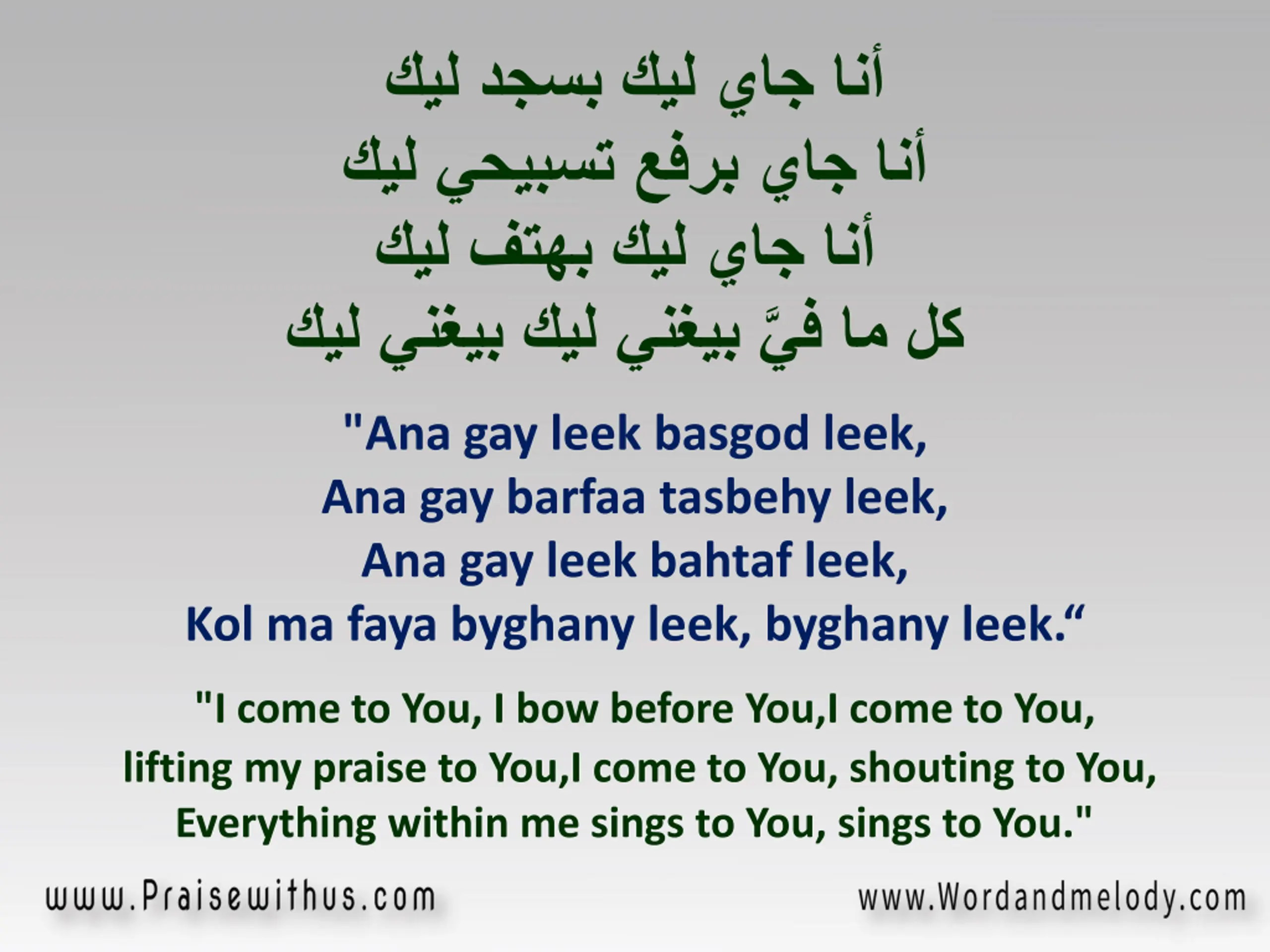 "Ana gay leek basgod leek, Ana gay barfaa tasbehy leek, Ana gay leek bahtaf leek, Kol ma faya byghany leek, byghany leek. "I come to You, I bow before You,I come to You, lifting my praise to You,I come to You, shouting to You, Everything within me sings to You, sings to You."