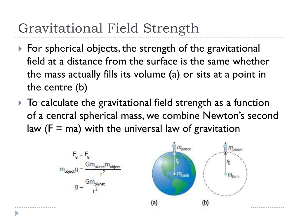 Gravitational Field Strength For spherical objects, the strength of the gravitational field at a distance from the surface is the same whether the mass actually fills its volume (a) or sits at a point in the centre (b) To calculate the gravitational field strength as a function of a central spherical mass, we combine Newton s second law (F = ma) with the universal law of gravitation