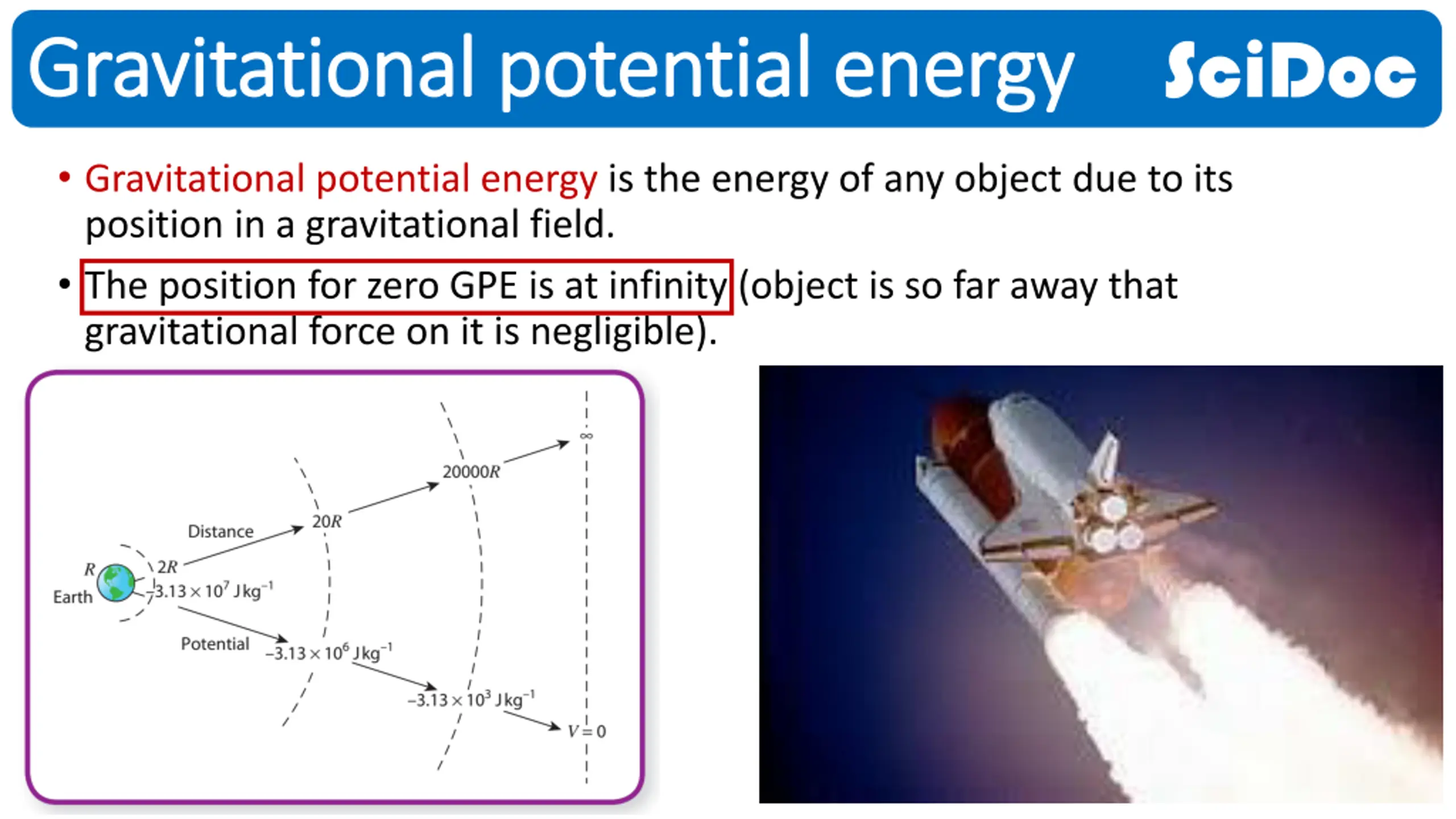 SciDoc Gravitational potential energy Gravitational potential energy Gravitational potential energy is the energy of any object due to its position in a gravitational field. The position for zero GPE is at infinity (object is so far away that gravitational force on it is negligible).