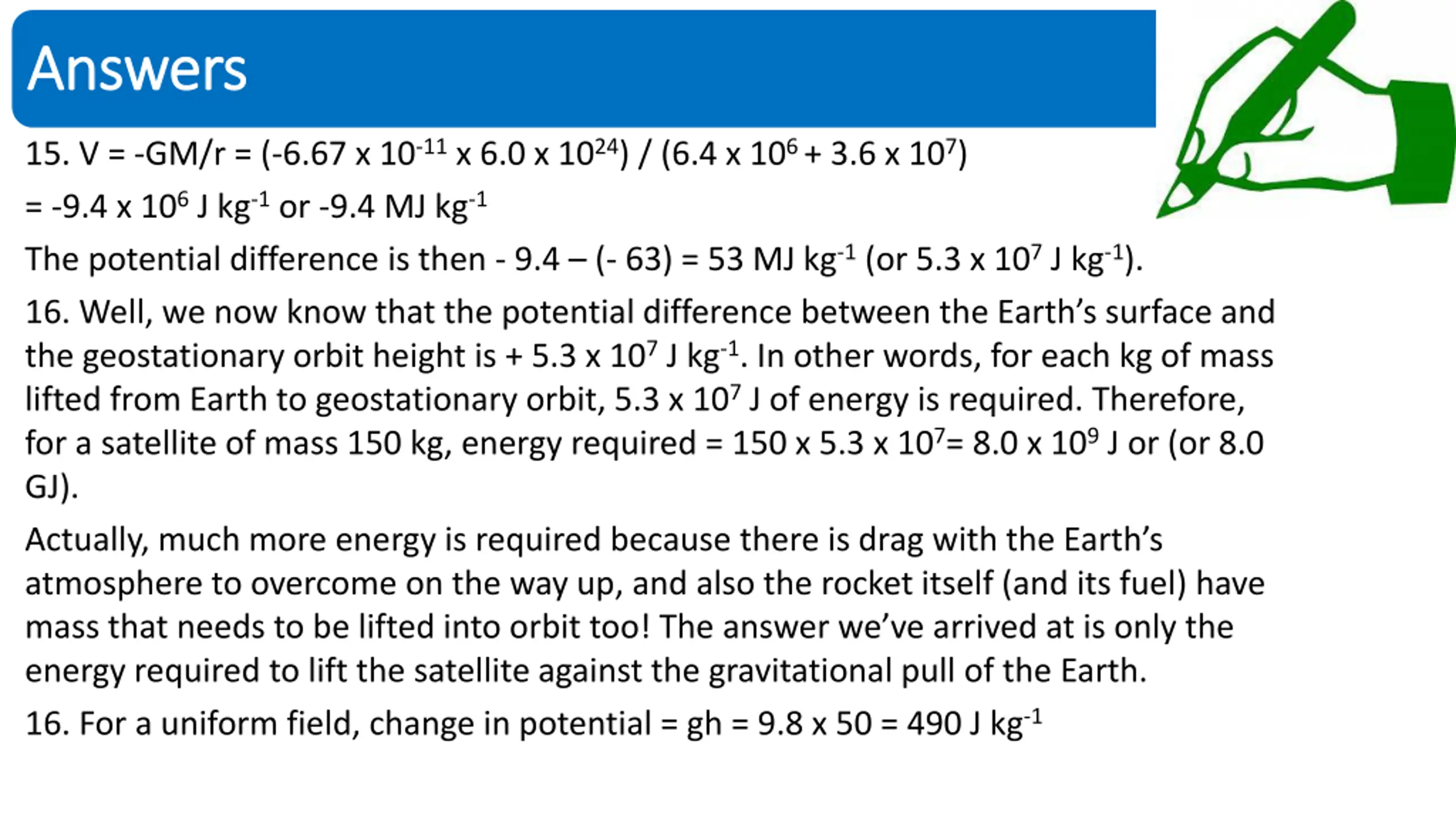 SciDoc Answers Answers 15. V = -GM/r = (-6.67 x 10-11 x 6.0 x 1024) / (6.4 x 106 + 3.6 x 107) = -9.4 x 106 J kg-1 or -9.4 MJ kg-1 The potential difference is then - 9.4 (- 63) = 53 MJ kg-1 (or 5.3 x 107 J kg-1). 16. Well, we now know that the potential difference between the Earth s surface and the geostationary orbit height is + 5.3 x 107 J kg-1. In other words, for each kg of mass lifted from Earth to geostationary orbit, 5.3 x 107 J of energy is required. Therefore, for a satellite of mass 150 kg, energy required = 150 x 5.3 x 107= 8.0 x 109 J or (or 8.0 GJ). Actually, much more energy is required because there is drag with the Earth s atmosphere to overcome on the way up, and also the rocket itself (and its fuel) have mass that needs to be lifted into orbit too! The answer we ve arrived at is only the energy required to lift the satellite against the gravitational pull of the Earth. 16. For a uniform field, change in potential = gh = 9.8 x 50 = 490 J kg-1