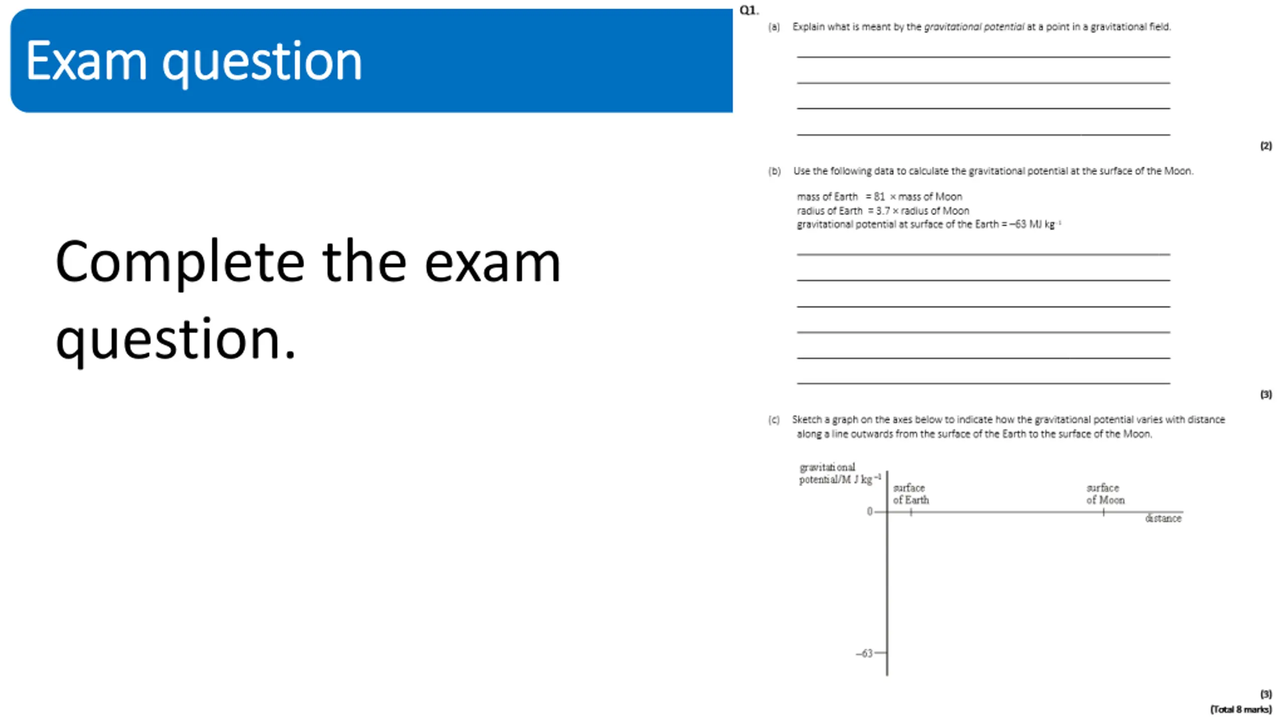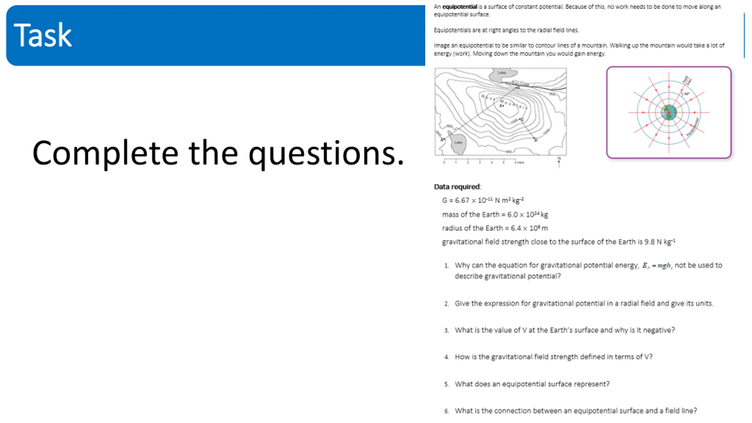 SciDoc Gravitational potential Gravitational potential 04/04/2025 04/04/2025 1. What is the equation we already know for gravitational potential energy? 2. A weight of mass 20kg is 10m above the surface of the Earth. How much GPE does it have? 3. If that mass was dropped from that height, with what speed would it hit the floor? 4. How does the gravitational field strength on the surface of the Earth compare to at the top of Mt. Everest? 5. Why do we think that the equation for GPE doesn t work at distances far from Earth?