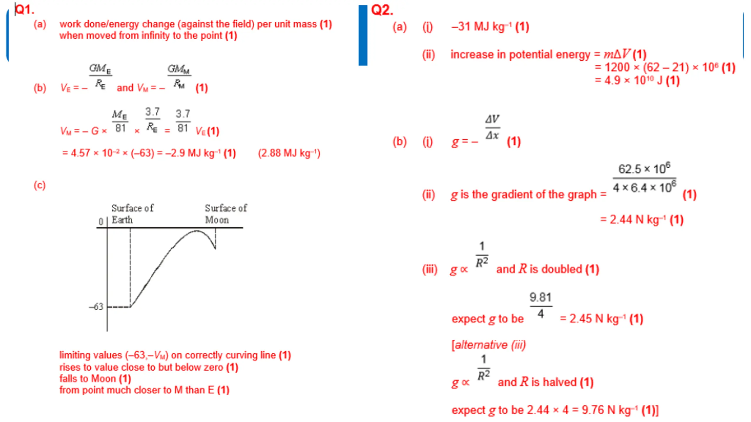 SciDoc Answers Answers 1. The value for g is not constant for large changes in h; the Earth s field is a radial field and so for only small changes of h (or r) can the field be considered uniform 2. V = GM/R; J kg 1 3. 63MJkg-1; the potential is defined as zero at infinity and therefore becomes increasingly negative as it approaches Earth; work 4. It is the gradient of a V r graph at the point r, i.e. g = V/ r 5. lines along which a mass experiences no change in gravitational potential 6. They are always perpendicular 7. Zero 8. E= m(V2 V1) 9. -3.8 109 J/kg 10. 1.9 1027 kg 11. 25.7 N/kg 12. The satellite moves along an equipotential and there is thus no change in potential energy; as total energy is conserved, there is no change in kinetic energy, so speed remains constant 13. GPE = -GMm/r = (- 6.67 x 10-11x 6.0 x 1024x 60) / 6.4 x 106= - 3.8 x 109J 14. V = -GM/r = (-6.67 x 10-11 x 6.0 x 1024) / 6.4 x 106 = - 6.3 x 107 J kg-1 or - 63 MJ kg-1