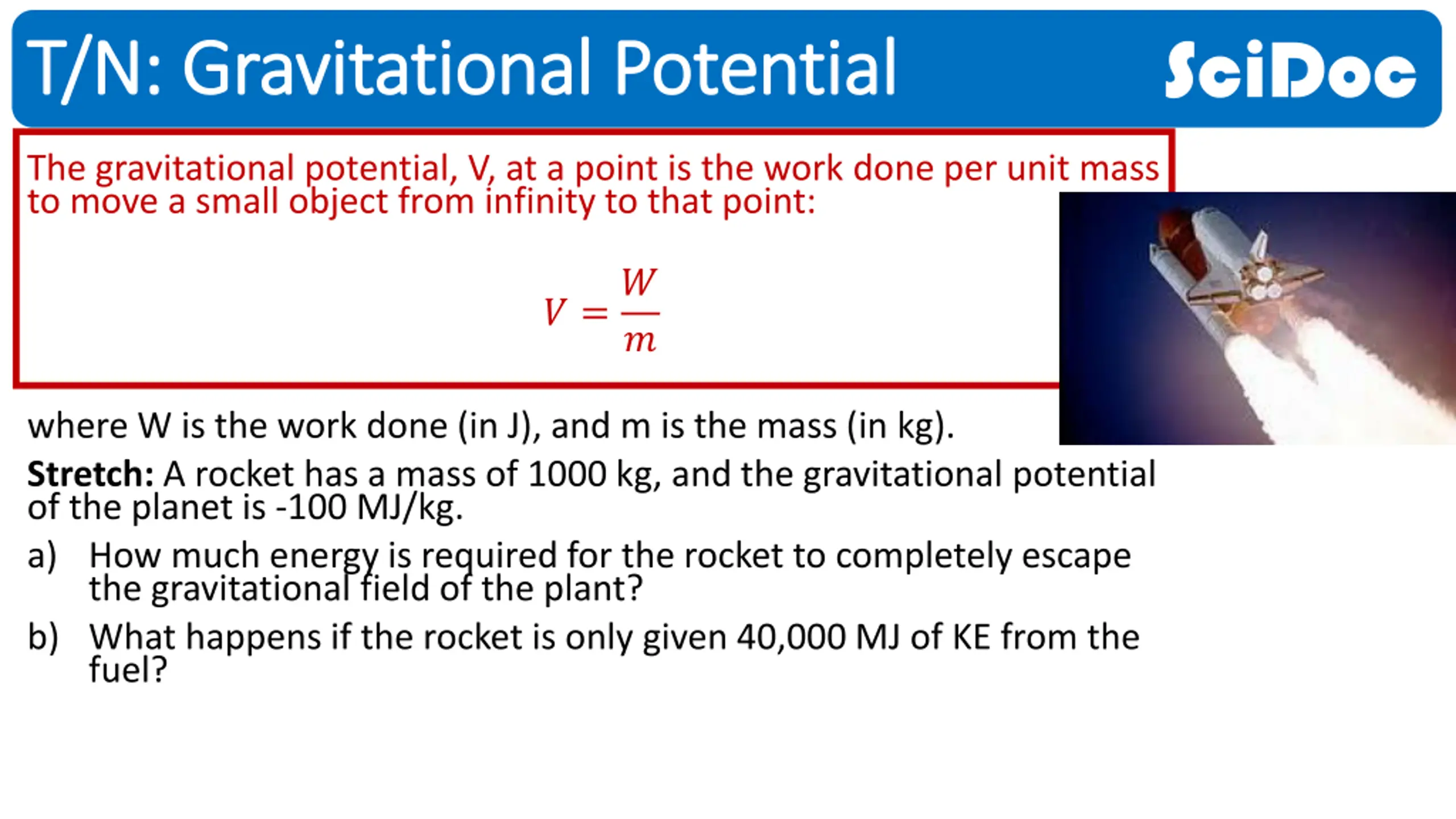 SciDoc T/N: Gravitational Potential T/N: Gravitational Potential The gravitational potential, V, at a point is the work done per unit mass to move a small object from infinity to that point: ? =? ? where W is the work done (in J), and m is the mass (in kg). Stretch: A rocket has a mass of 1000 kg, and the gravitational potential of the planet is -100 MJ/kg. a) How much energy is required for the rocket to completely escape the gravitational field of the plant? b) What happens if the rocket is only given 40,000 MJ of KE from the fuel?