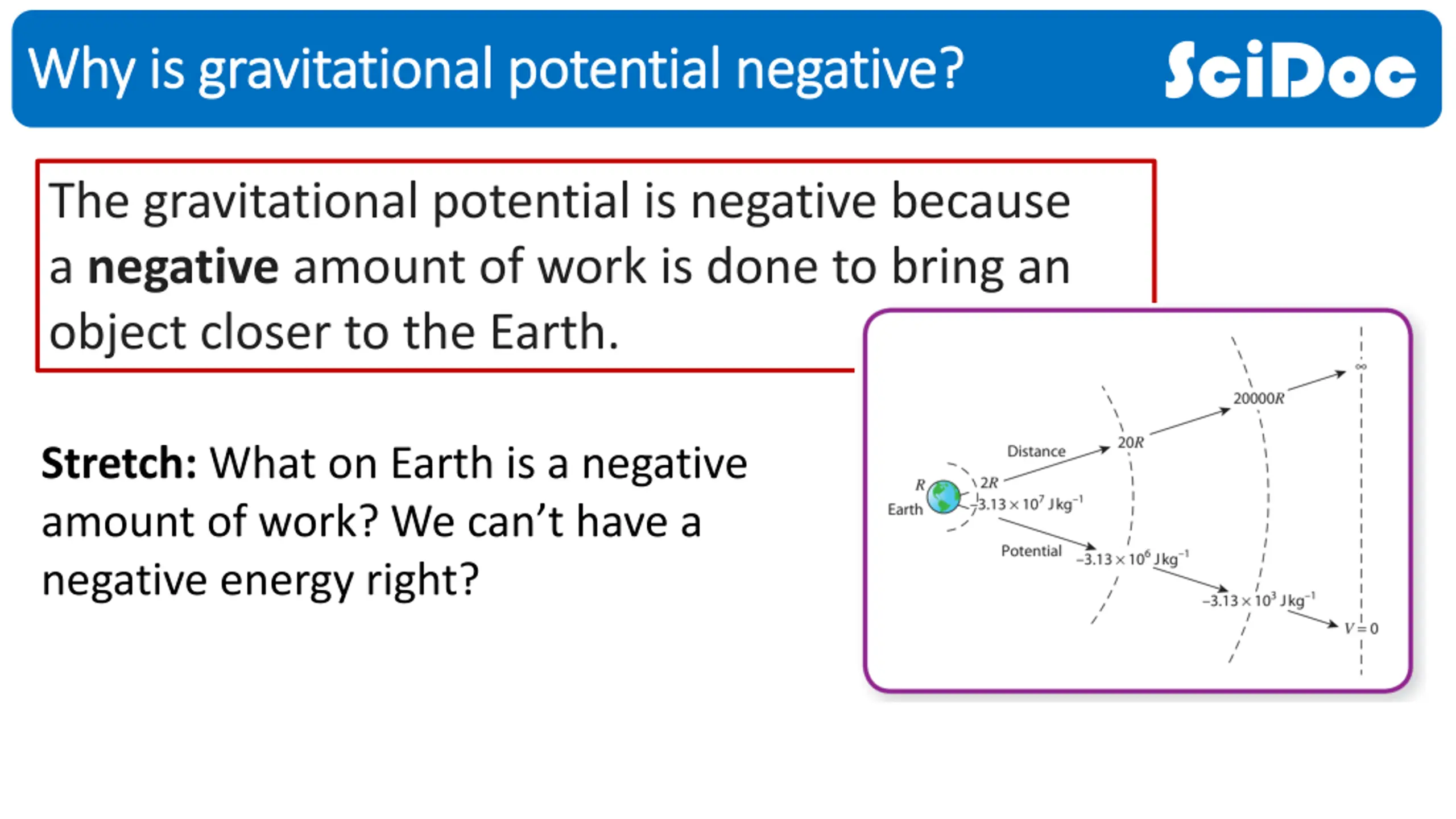 SciDoc Why is gravitational potential negative? Why is gravitational potential negative? The gravitational potential is negative because a negative amount of work is done to bring an object closer to the Earth. Stretch: What on Earth is a negative amount of work? We can t have a negative energy right?
