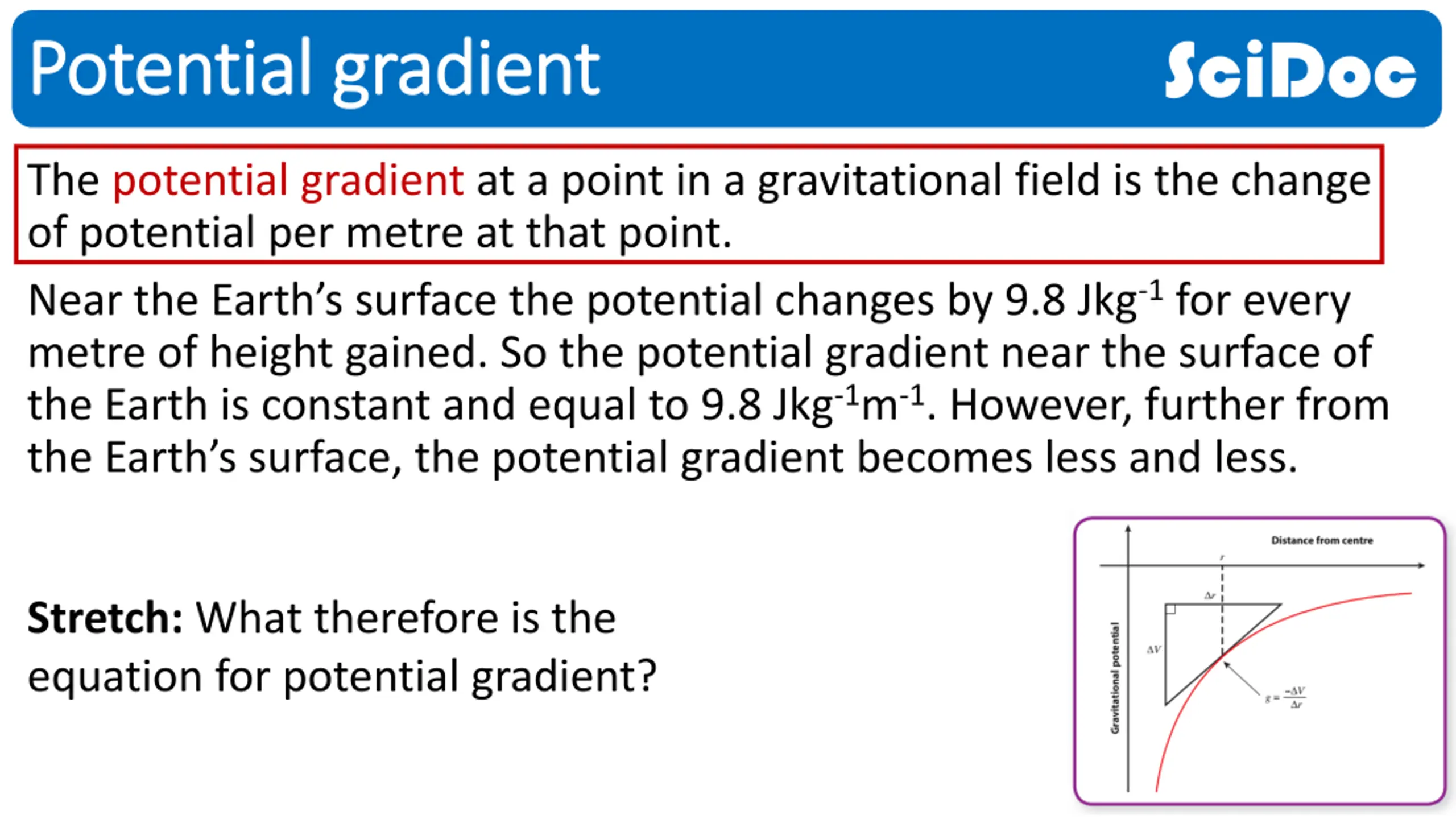 SciDoc Potential gradient Potential gradient The potential gradient at a point in a gravitational field is the change of potential per metre at that point. Near the Earth s surface the potential changes by 9.8 Jkg-1 for every metre of height gained. So the potential gradient near the surface of the Earth is constant and equal to 9.8 Jkg-1m-1. However, further from the Earth s surface, the potential gradient becomes less and less. Stretch: What therefore is the equation for potential gradient?