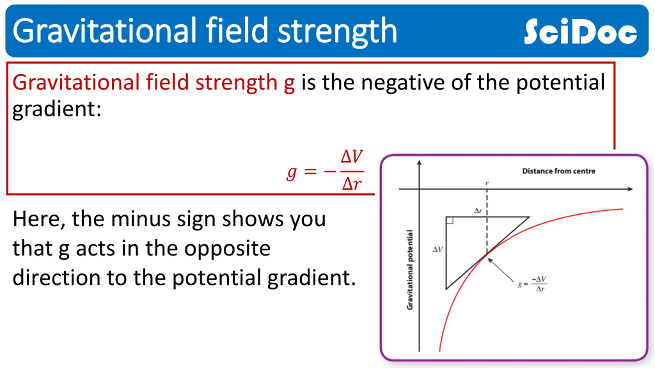 SciDoc Gravitational field strength Gravitational field strength Gravitational field strength g is the negative of the potential gradient: ? = ? ? Here, the minus sign shows you that g acts in the opposite direction to the potential gradient.