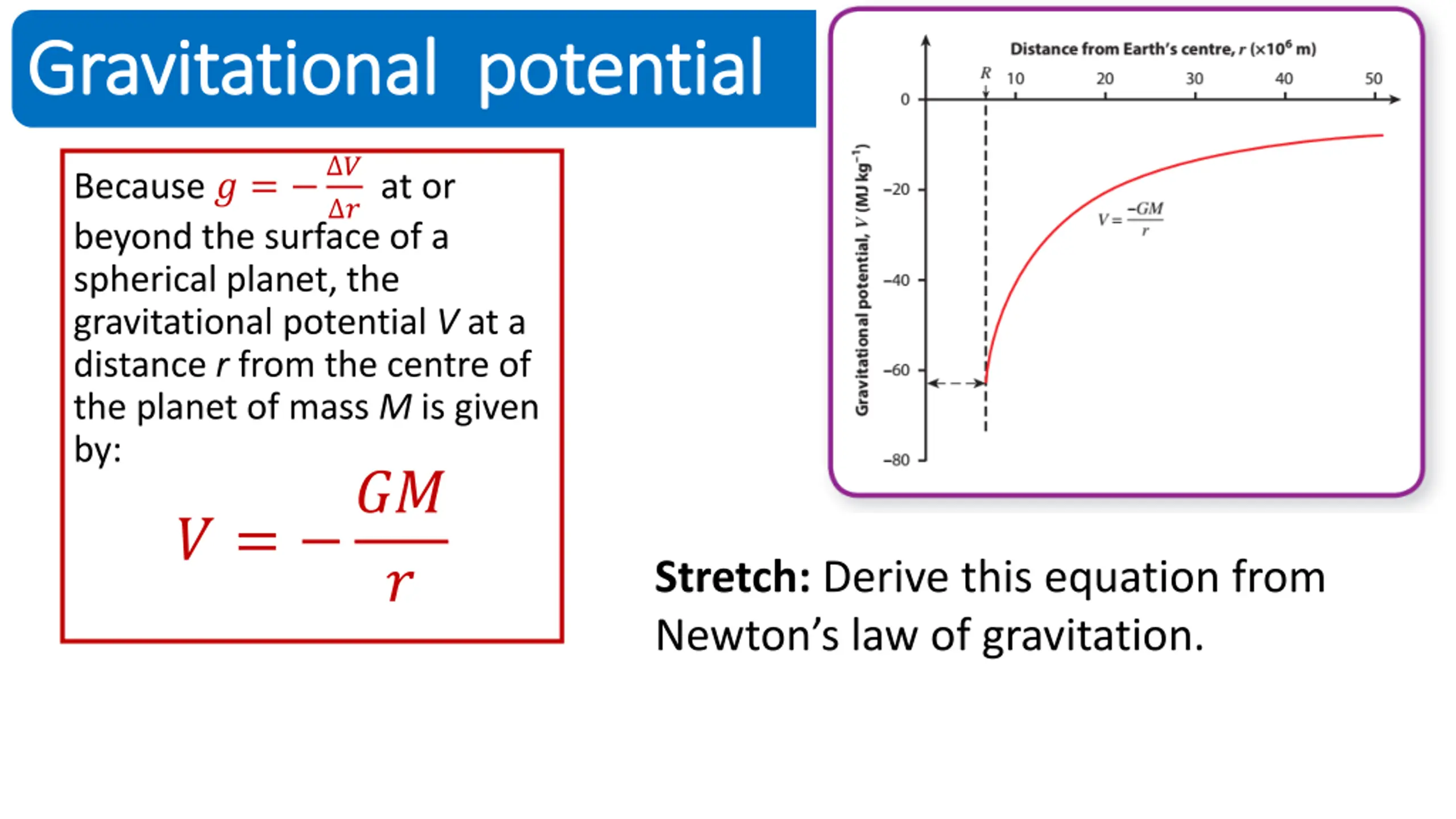 SciDoc Gravitational potential Gravitational potential Because ? = ? beyond the surface of a spherical planet, the gravitational potential V at a distance r from the centre of the planet of mass M is given by: ? = ?? ? at or ? Stretch: Derive this equation from Newton s law of gravitation.