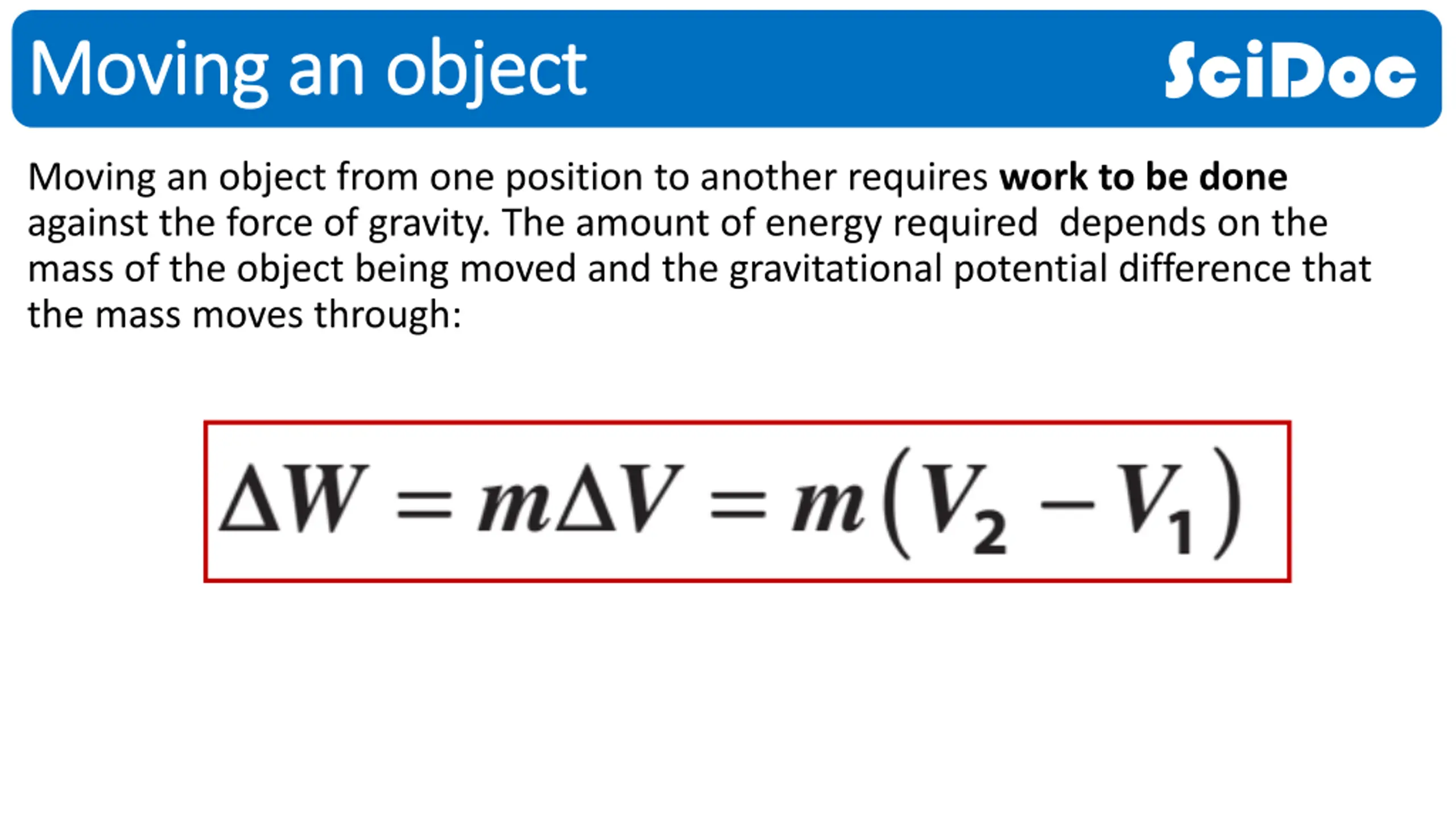 SciDoc Moving an object Moving an object Moving an object from one position to another requires work to be done against the force of gravity. The amount of energy required depends on the mass of the object being moved and the gravitational potential difference that the mass moves through:
